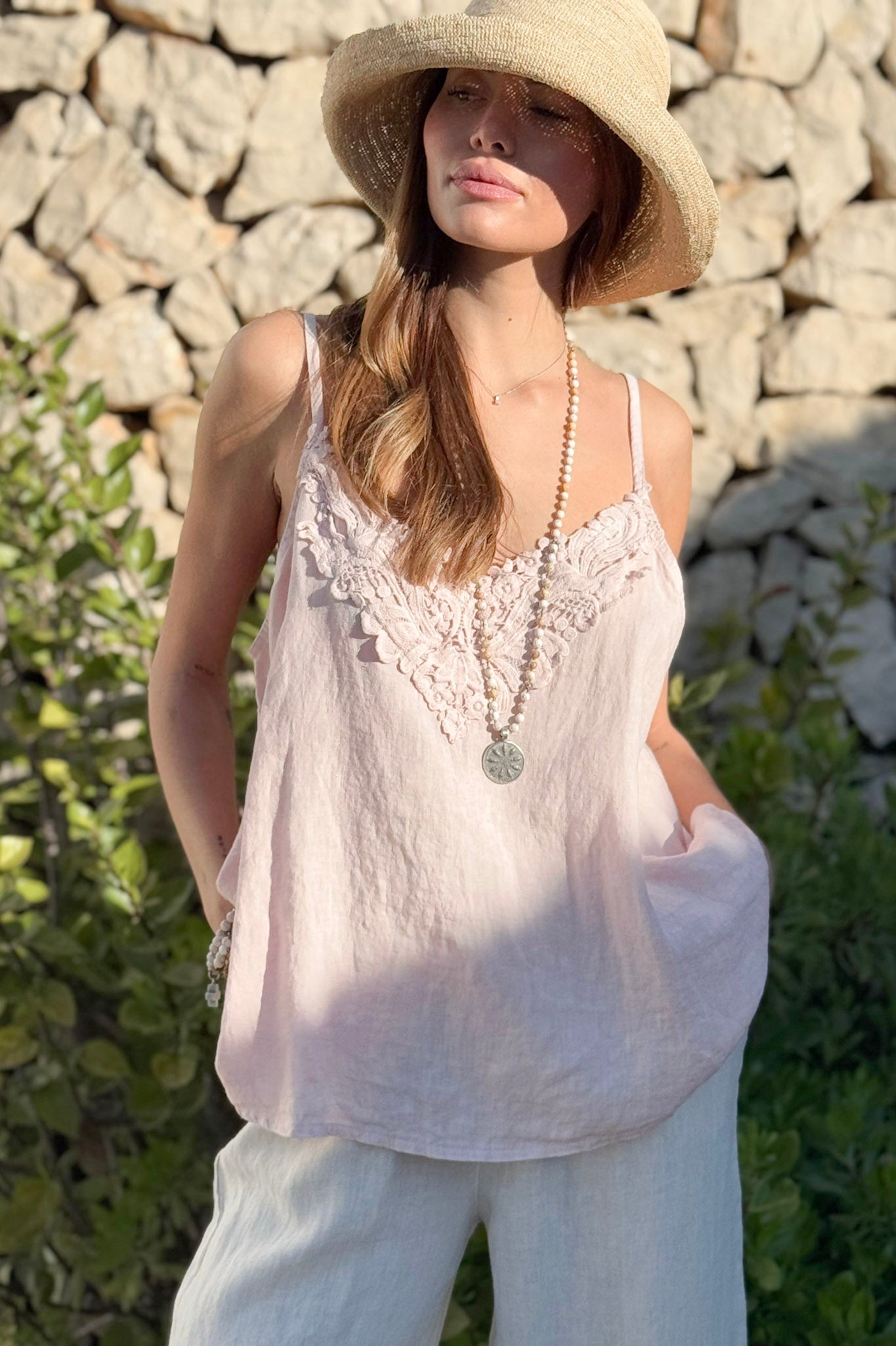 Lightweight and airy top with a V-neckline, featuring a beautiful floral embroidery on the front. The flared A-line silhouette creates a flattering shape and feels comfortable to wear. Adjustable tie shoulder straps complete the fit.