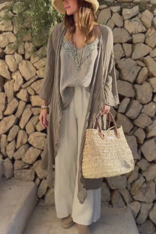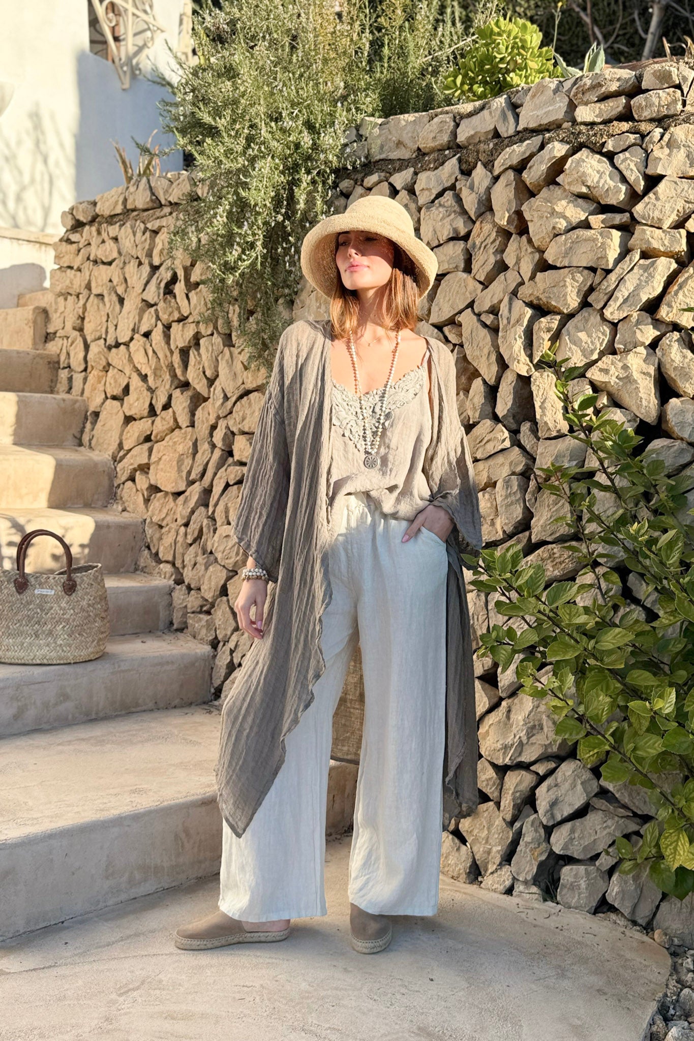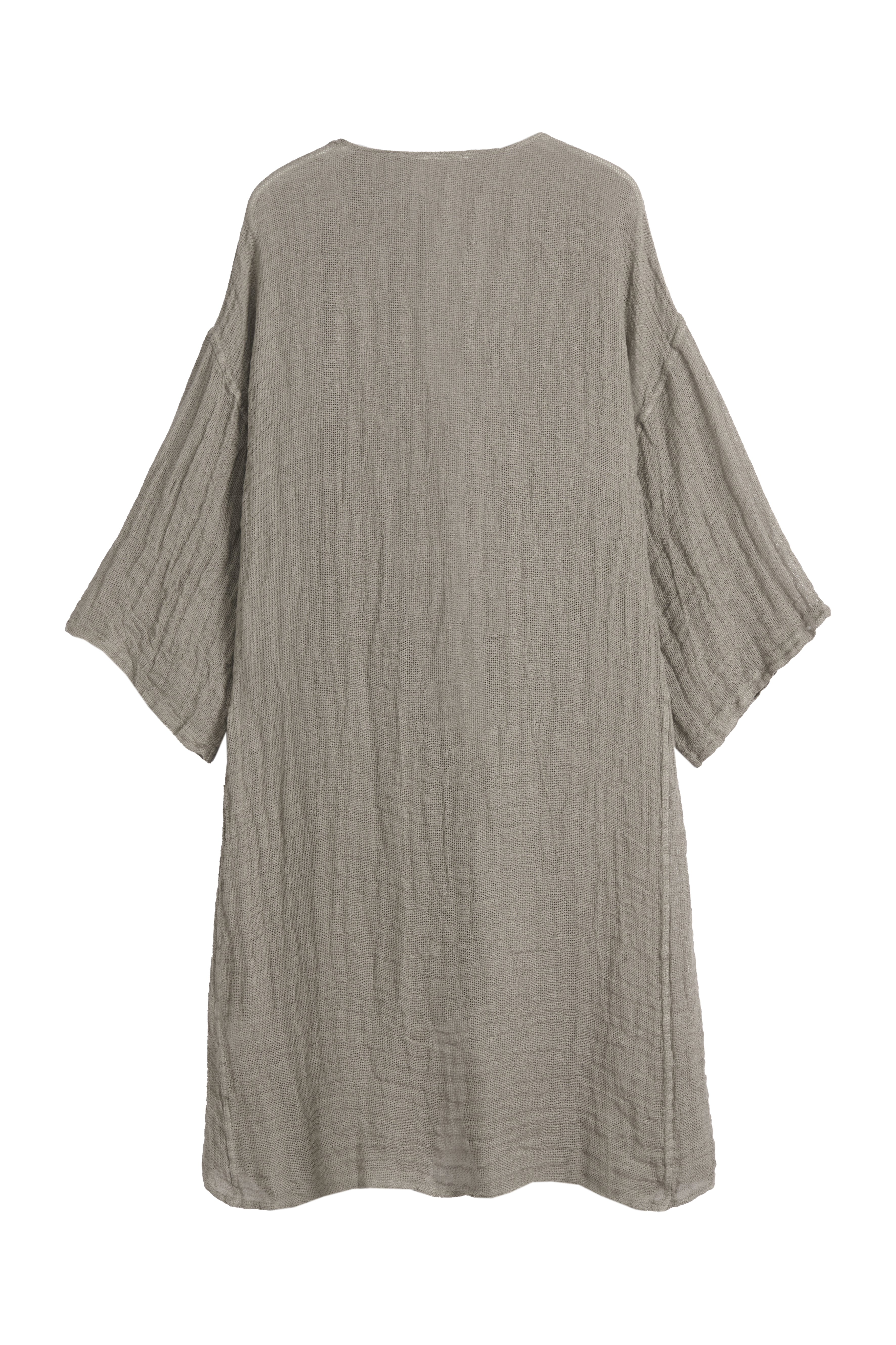 The light and airy linen kaftan enchants with its natural lightness and relaxed elegance. Crafted from soft, lightly textured linen, it drapes beautifully and feels comfortable against the skin. The loose fit, asymmetrical hemline, and finished edges give the kaftan a bohemian, effortless look. The color of the product is slightly darker in real life than in the images.