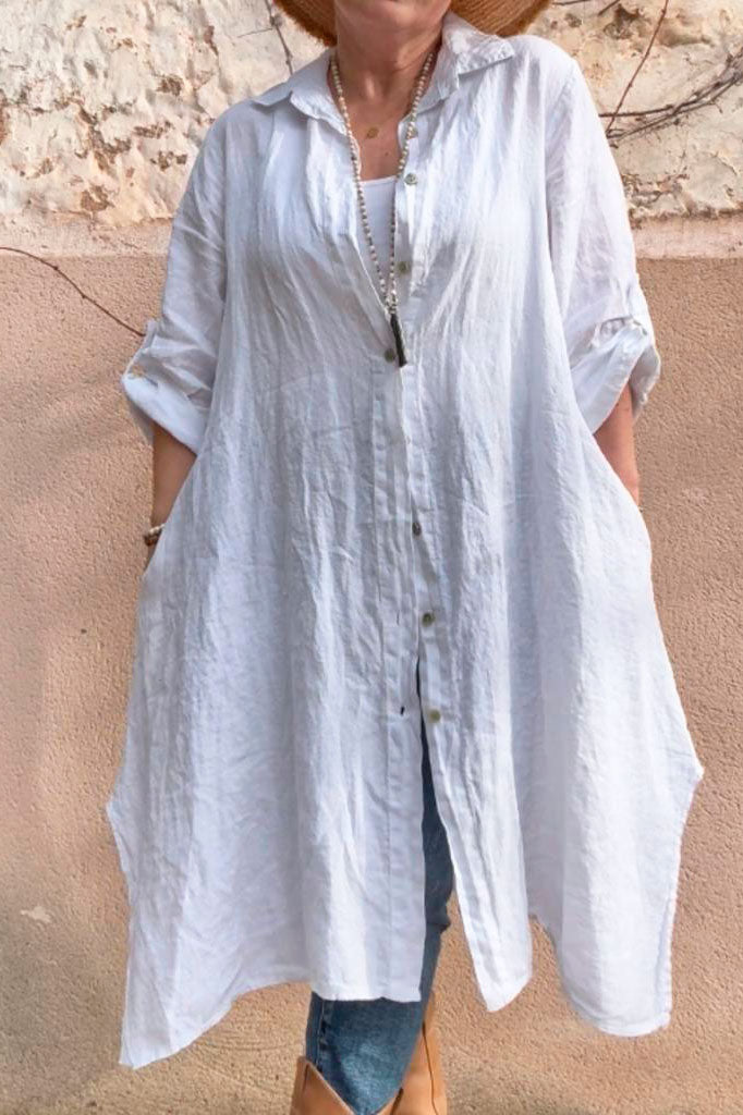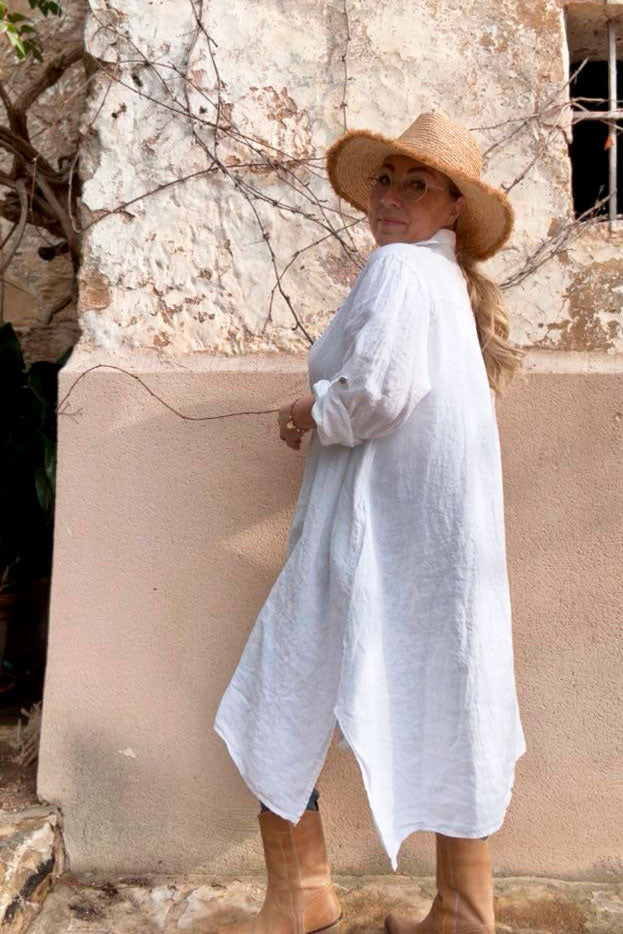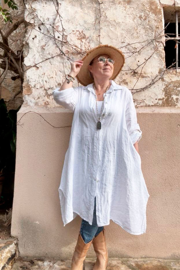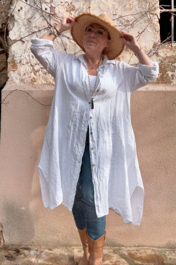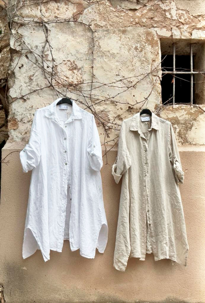 Upea pellavainen paitamekko, jossa kaulukset, halkiot sivuilla ja edessä napitus. Täydellinen pitkä ja kevyt paitamekko, joka sopii puettavaksi sekä pellavahousujen, että farkkujen kanssa.