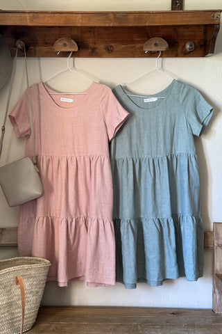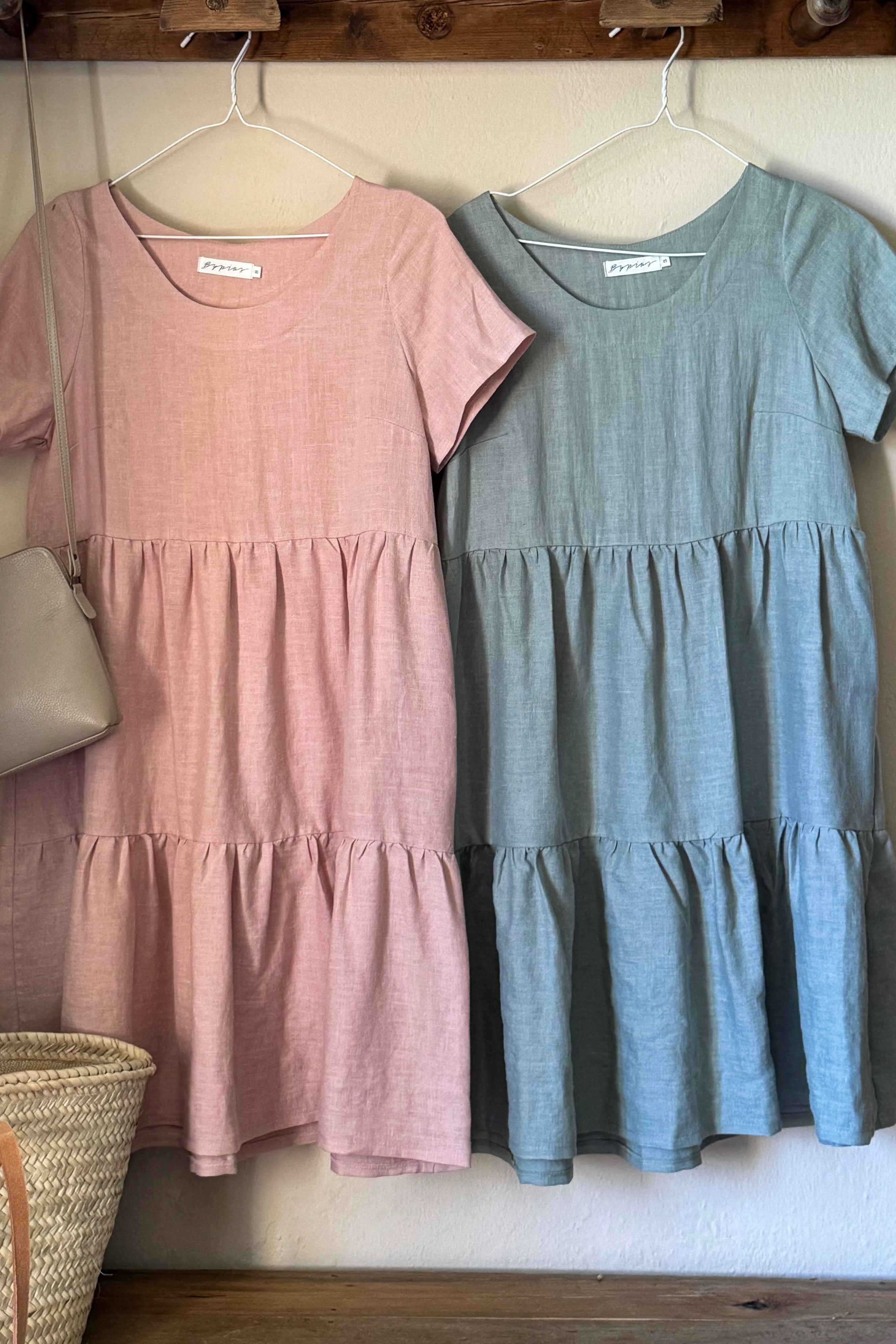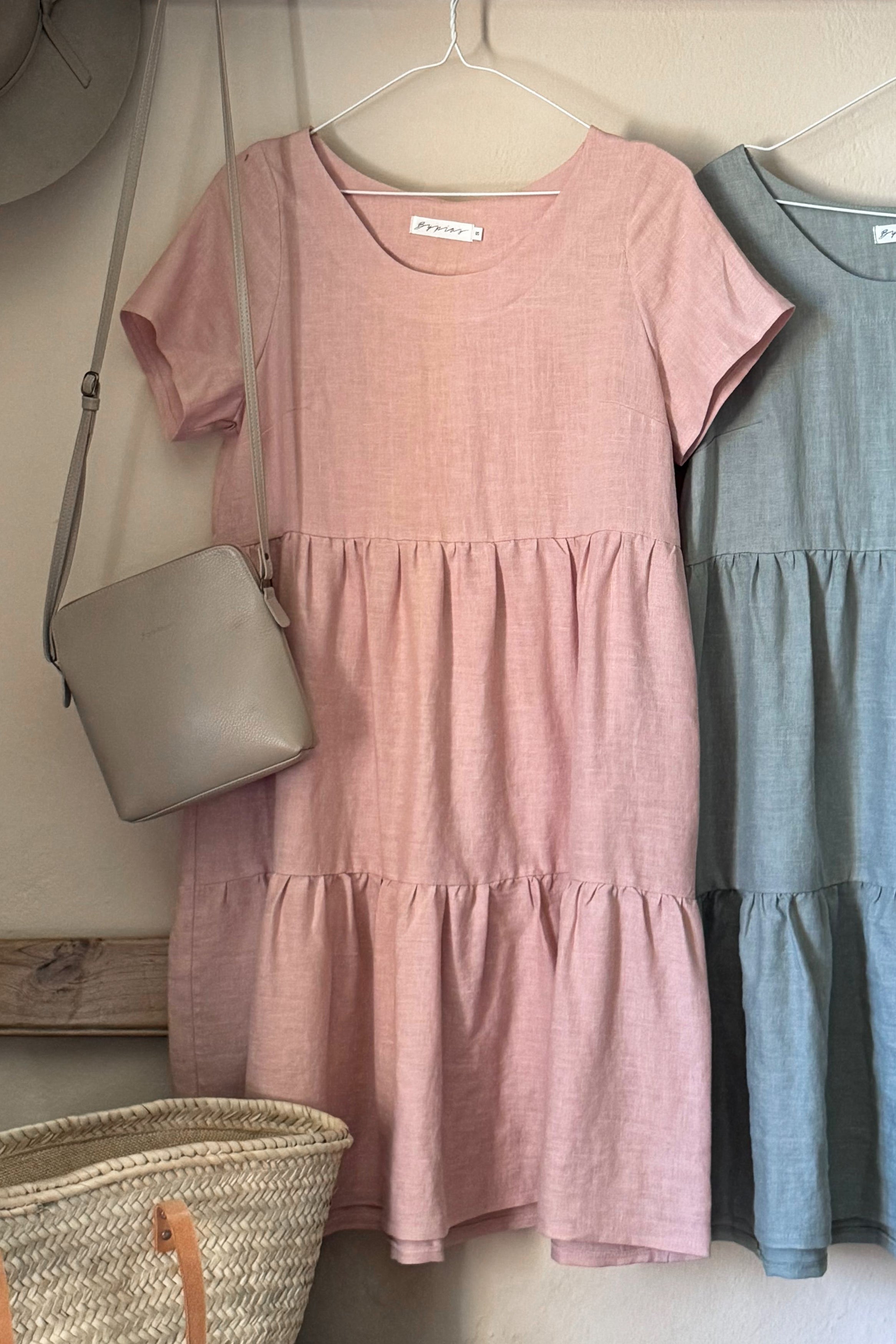 Tässä on mekko, joka hurmaa yksinkertaisella kauneudellaan ja ilmavalla keveydellään. Pehmeästä ja laadukkaasta pellavasta valmistettu mekko tuntuu ihanan raikkaalta ihoa vasten ja laskeutuu kauniisti. Reiluhkoa kokoa oleva, rennosti levenevä, kerrostettu malli tuo mekkoon leikkisyyttä ja huolettoman eleganssin, ja lyhyet hihat sekä pyöreä pääntie viimeistelevät ajattoman ilmeen.
