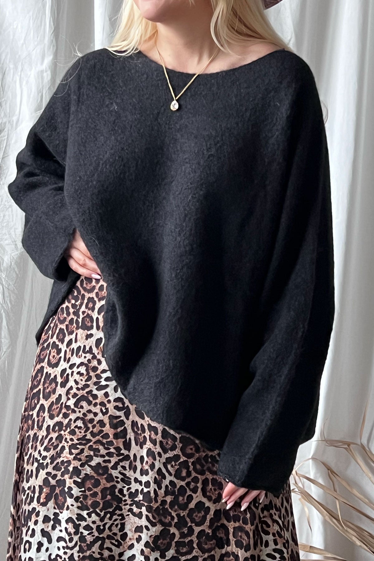 Ihanan pehmeä ja ylellinen neule alpakan ja neitsytvillan yhdistelmää, jossa venepääntie ja raglanhihat. Vajaamittainen malli, oka käy hyvin myös mekkojen ja paitisten päälle. Hyvin joustava materiaali.