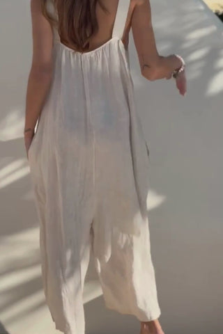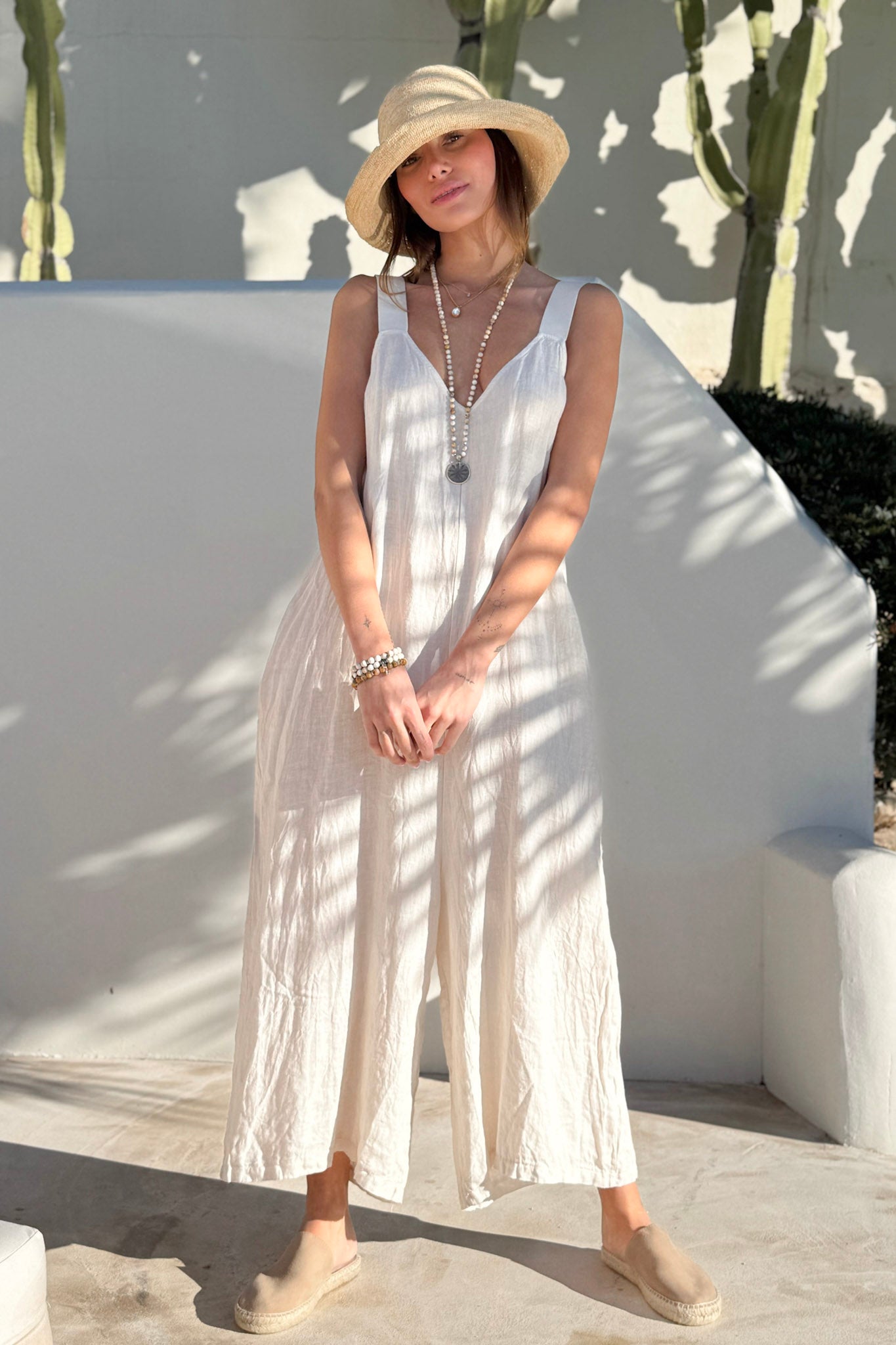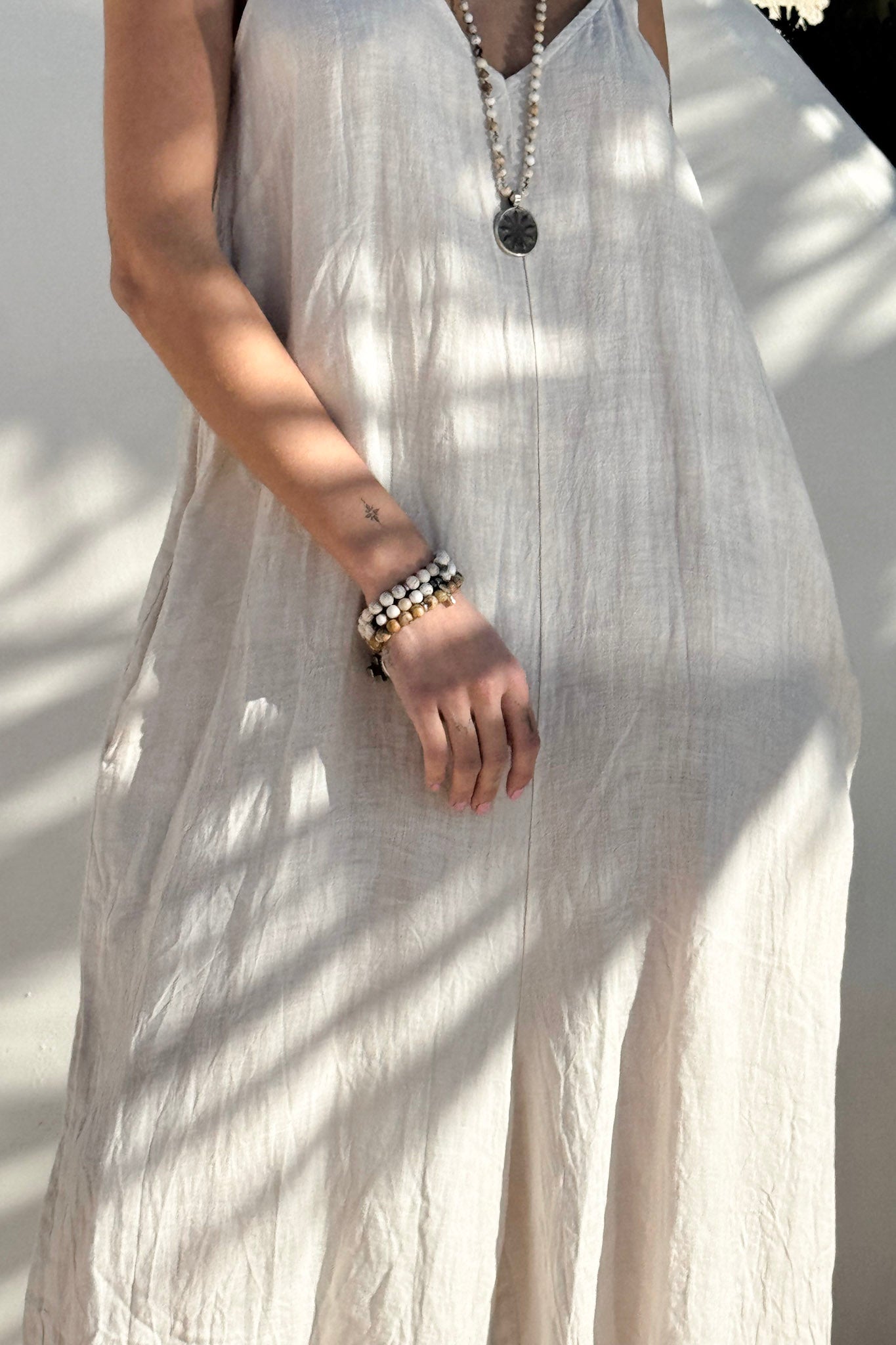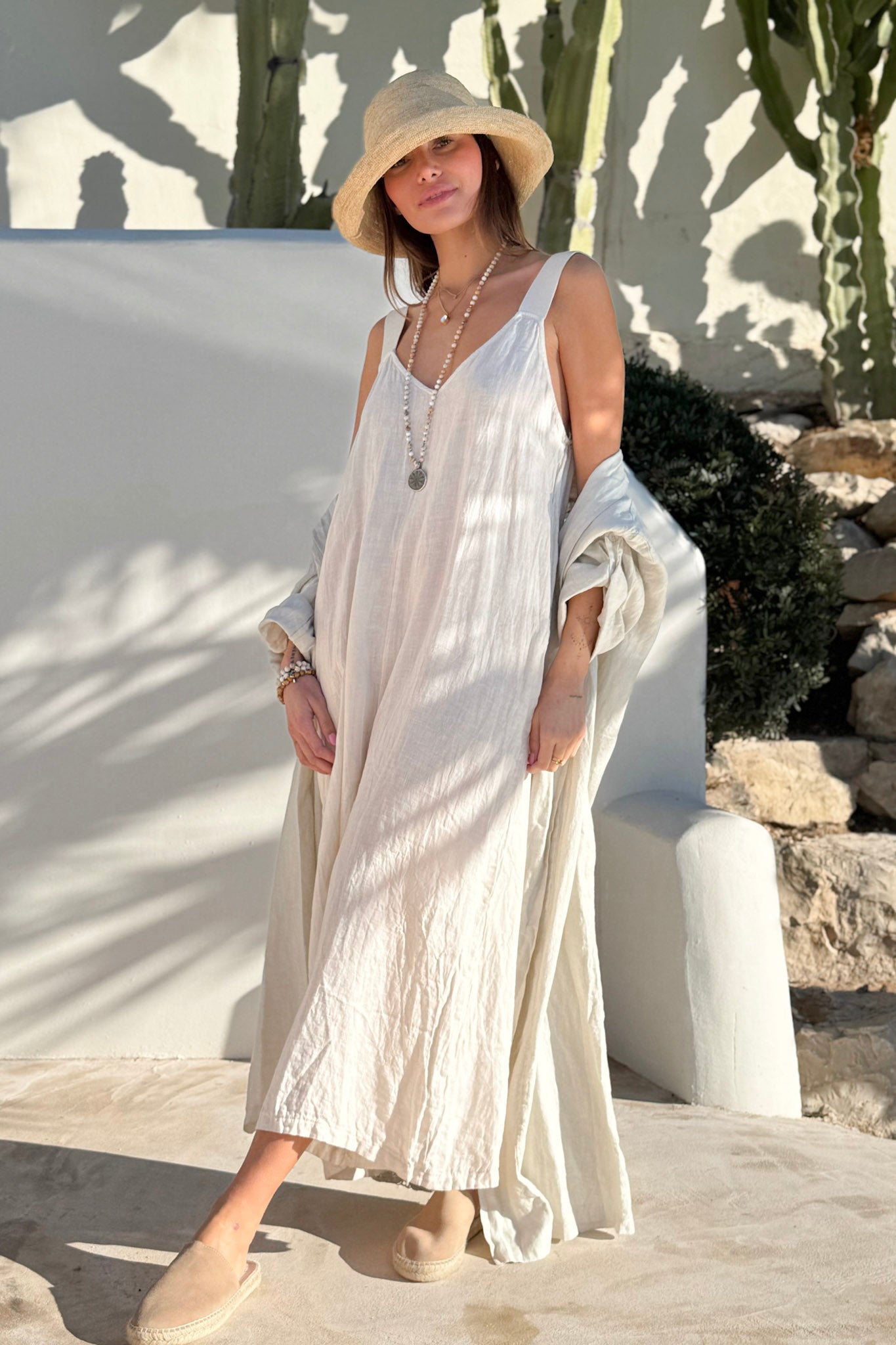 Rento pellavahaalari, jossa V-pääntie, tukevat olkanauhat ja leveät, vajaamittaiset lahkeet.