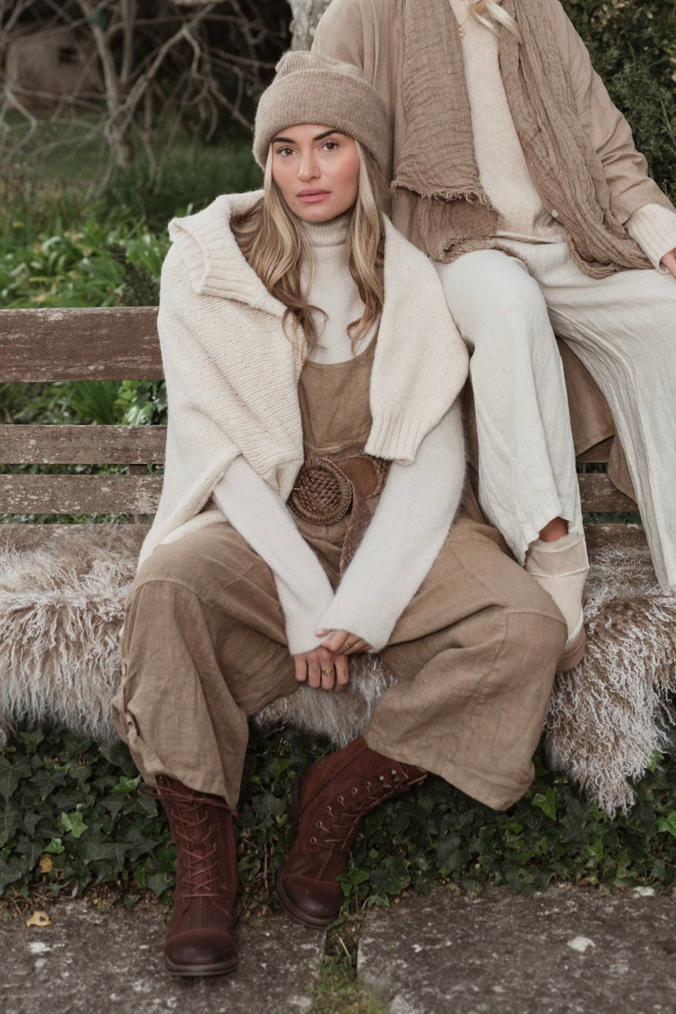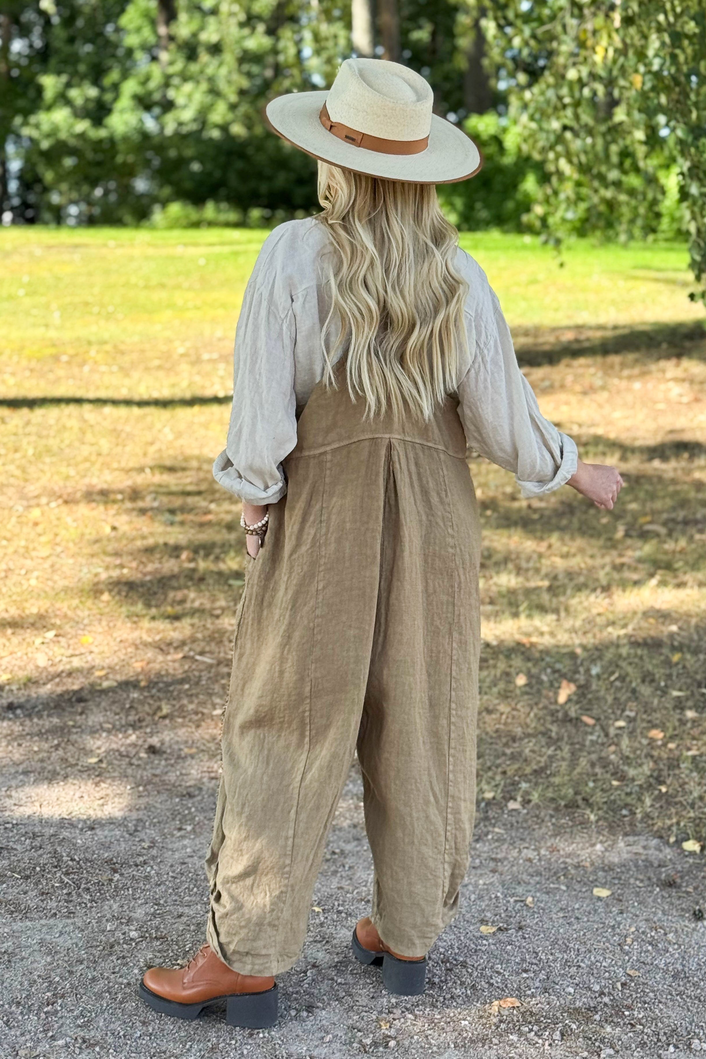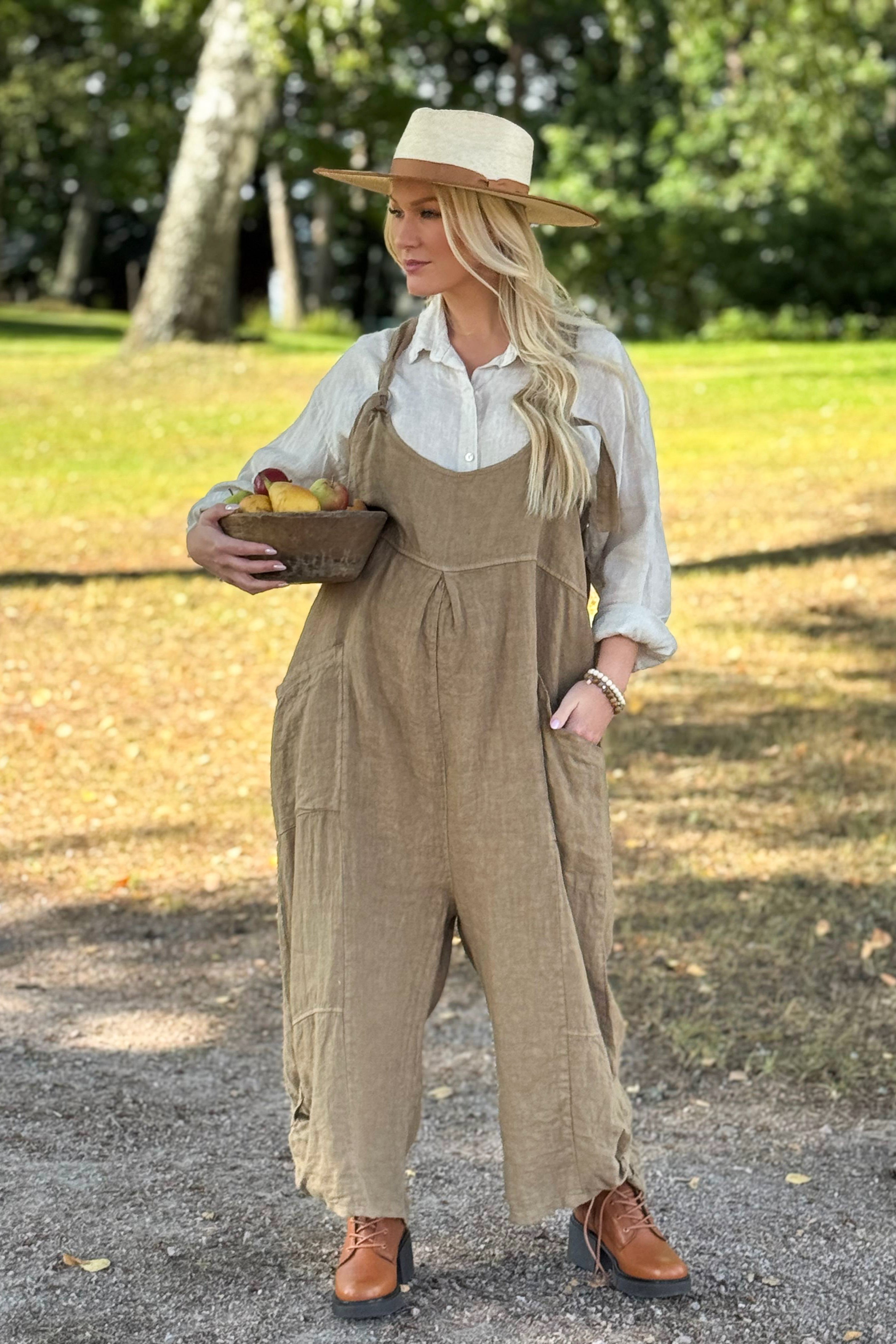 Väljä oversize-malli menee monenkokoiselle, haaraosa roikkuu alhaalla ja syvät taskut. Solmittavat, säädettävät olkaimet ja lahkeissa nappitamppi-detalji. Vintage-pesukäsiteltyä pellavaa.