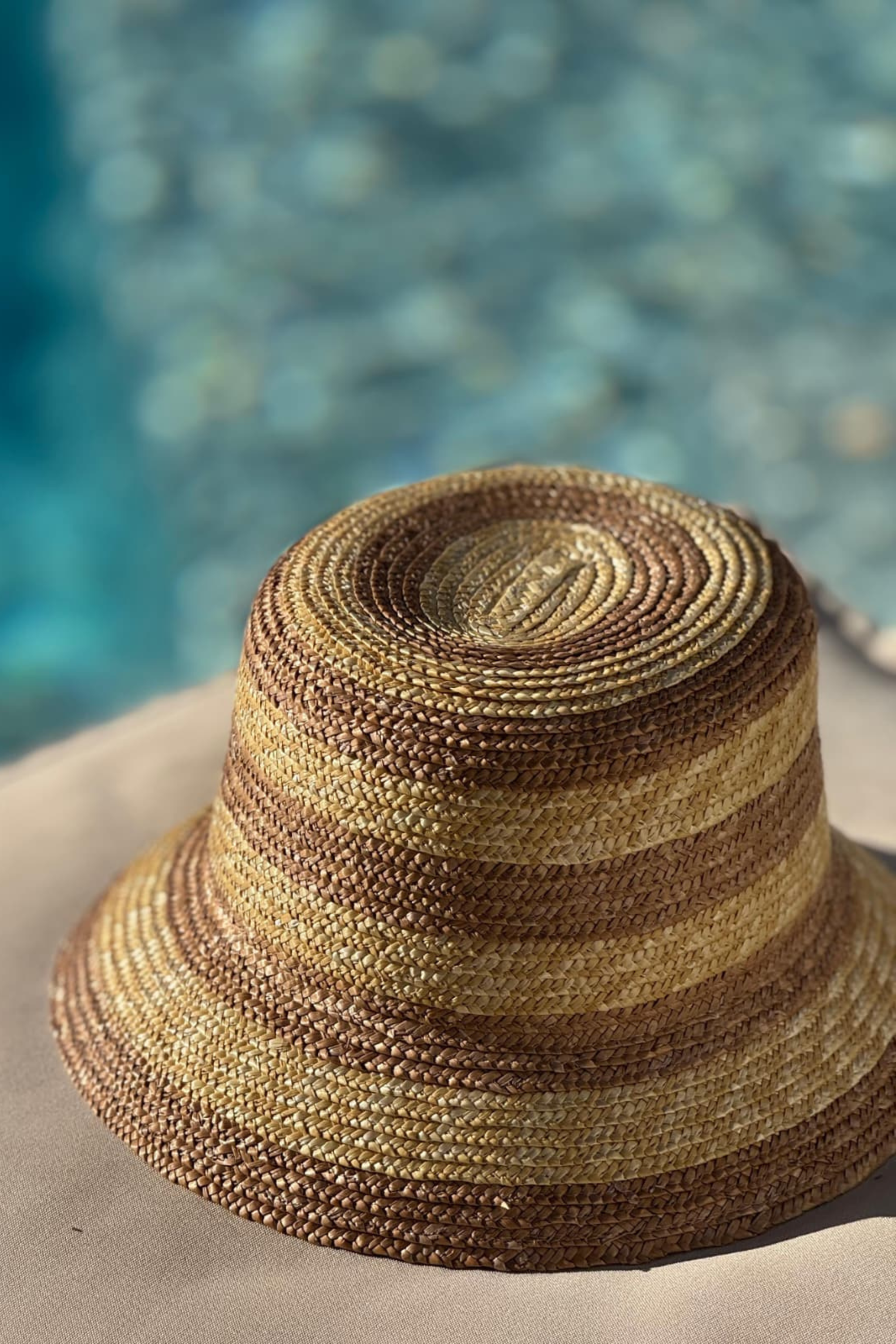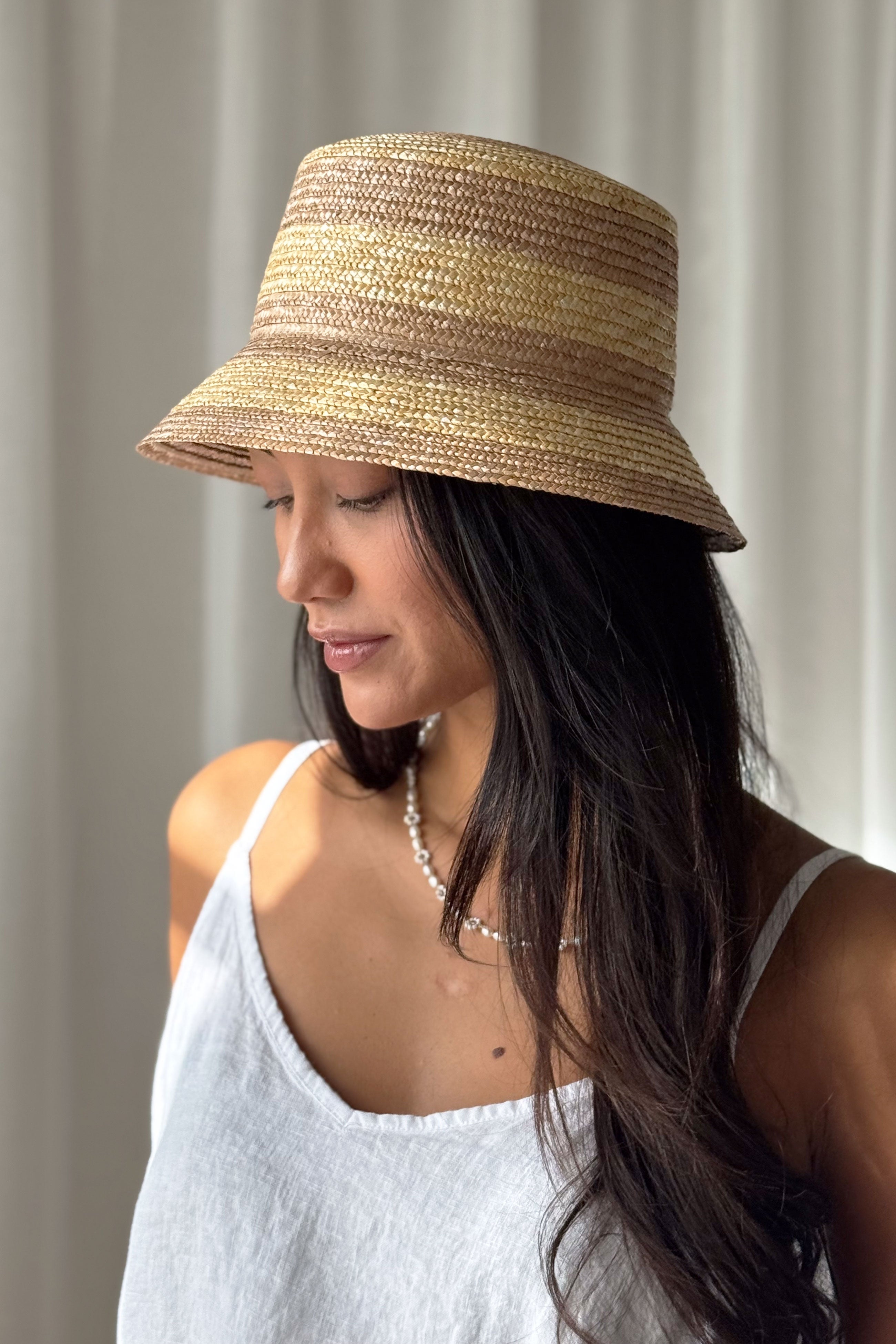 Hurmaava, BYPIAS signature korihattu. Luonnonmateriaalista käsityönä valmistettu hattu viimeistelee upean kesätyylisi ja muotoutuu pehmeästi päähän. Kauniisti alaspäin kaartuva lieri ja kaksivärinen raidoitus antavat hatulle veikeän ilmeen.