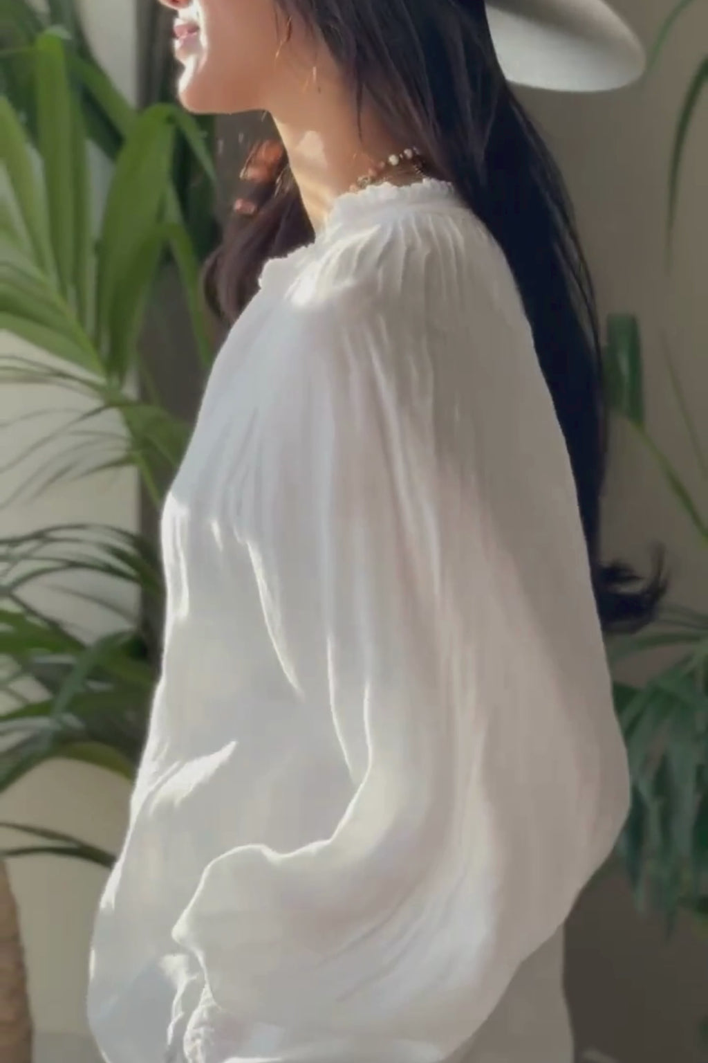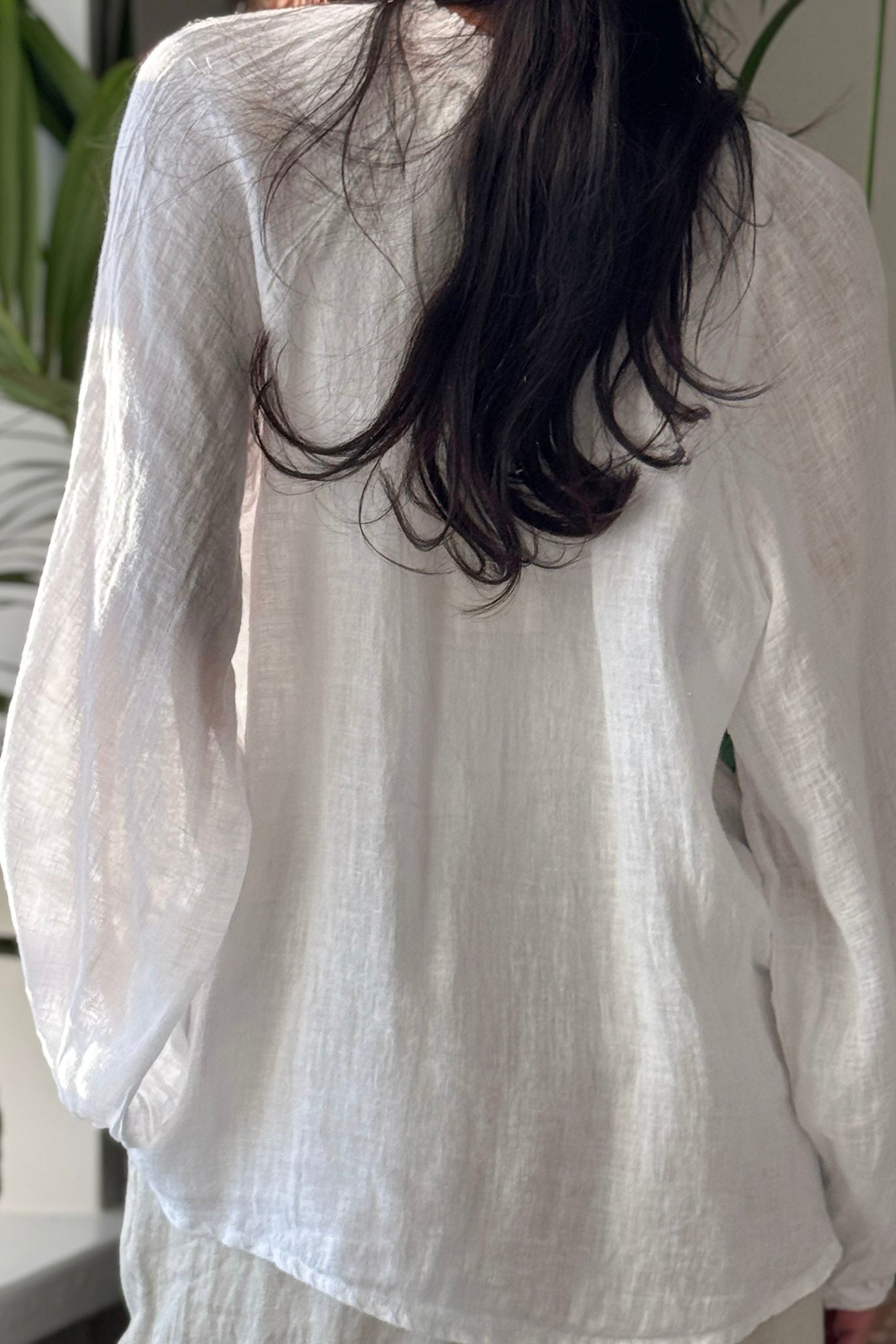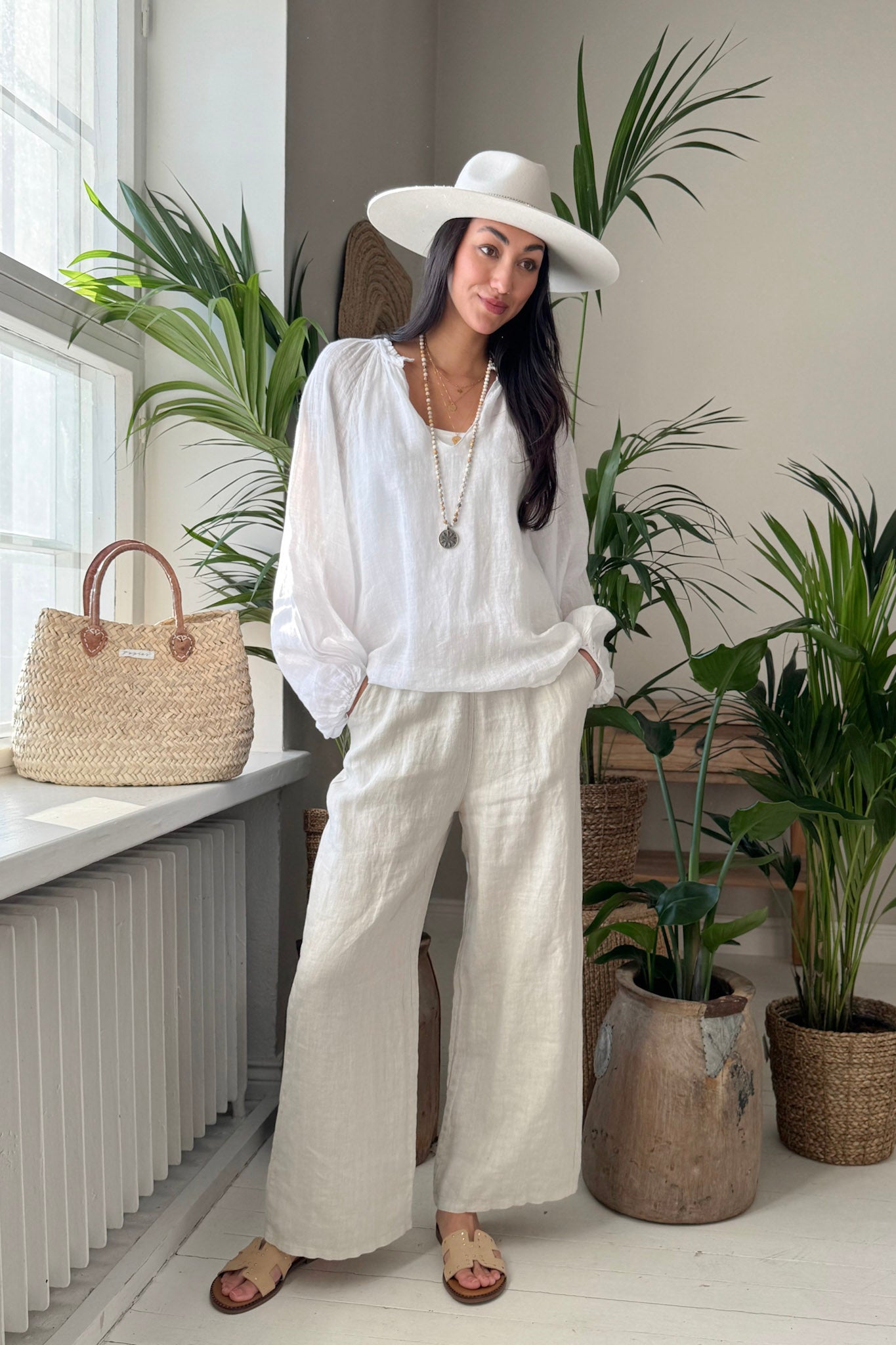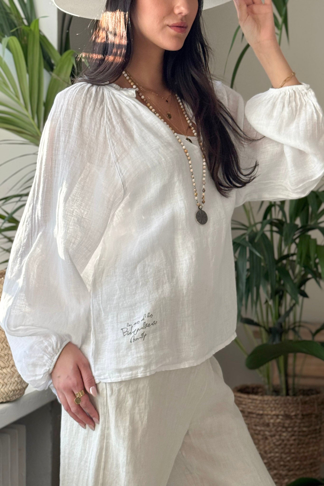 Ihanan ilmava pellavapaita syvällä v-pääntiellä ja röyhelökauluksella. Leveät puhvimaiset hihat tuovat vapautta liikkumiseen, hihansuissa resorit. Bohemiana Family painatus edessä.