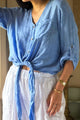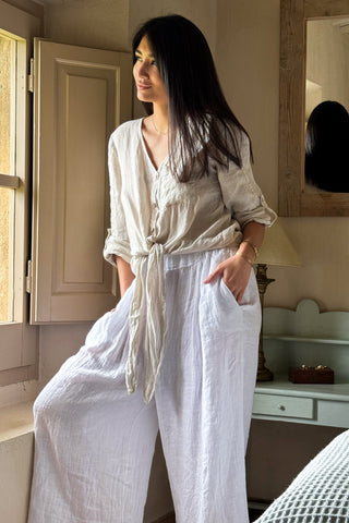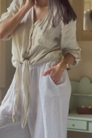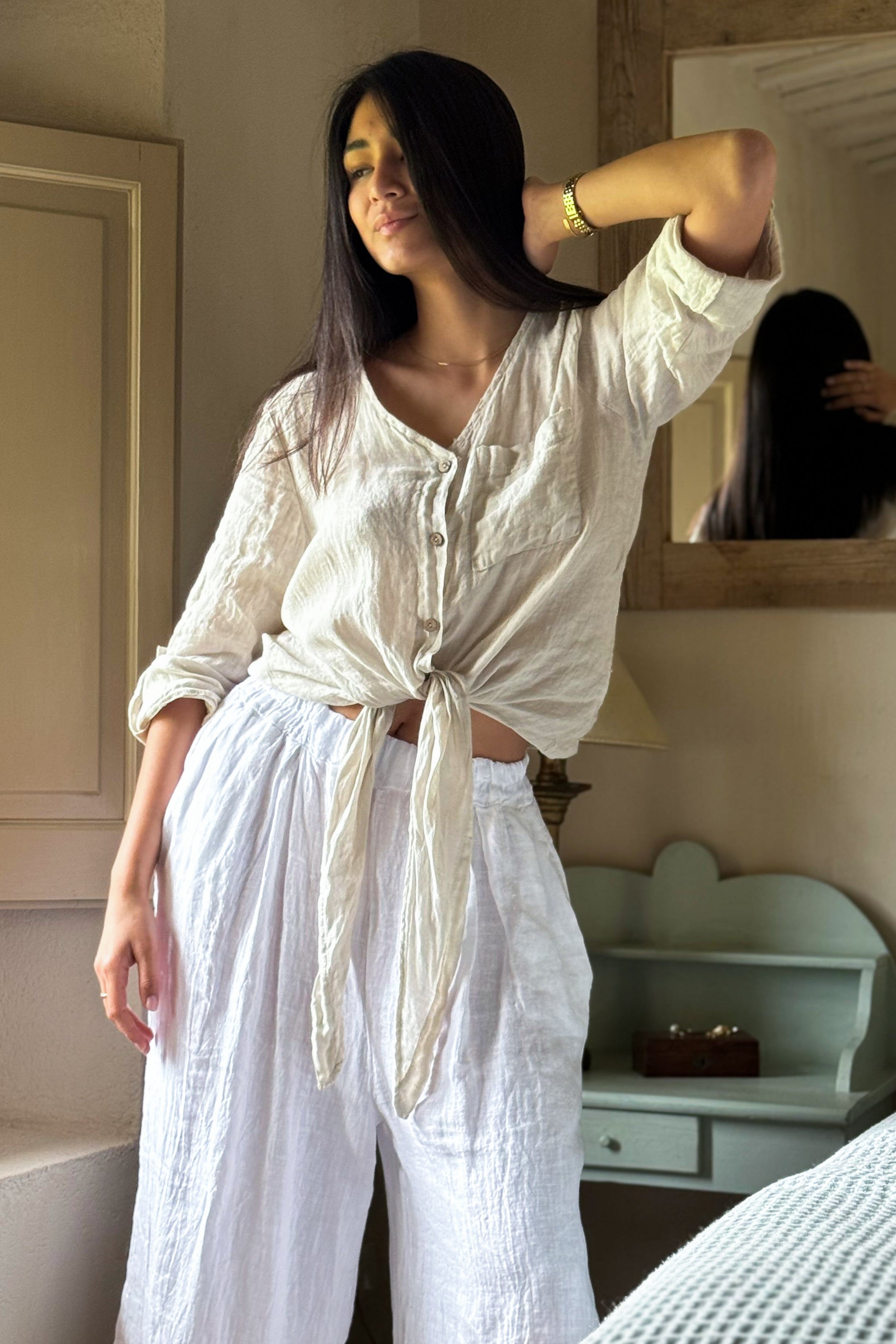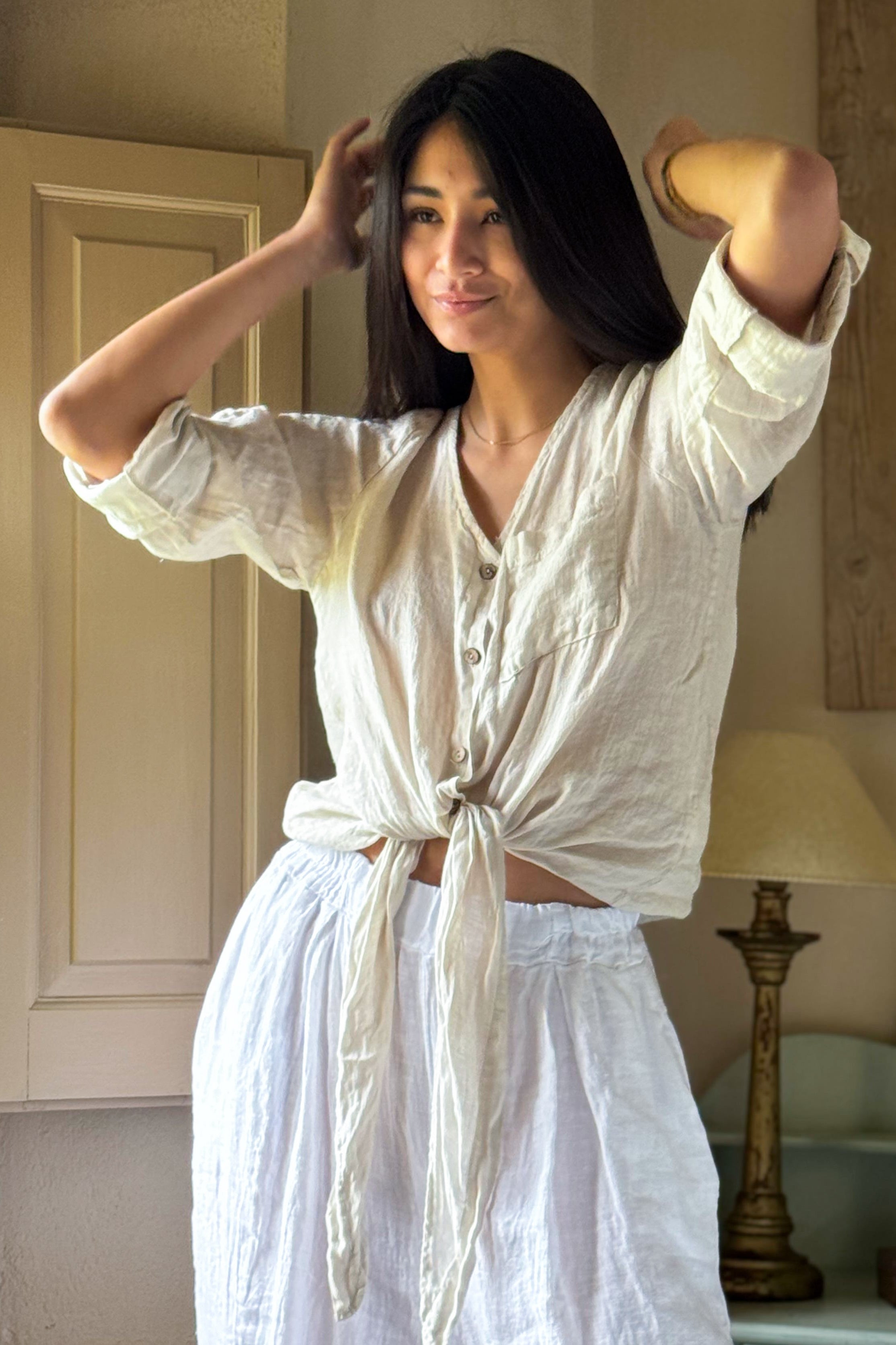 Monikäyttöinen pellavapaita, jossa on trendikäs solmukohta helmassa. Paita on väljästi leikattu, ja siinä on v-pääntie sekä nappikiinnitys, jotka tuovat keveyttä ja helppoa tyylikkyyttä. Käärittävät hihat ja rintatasku lisäävät käytännöllisyyttä ja rentoa ilmettä.