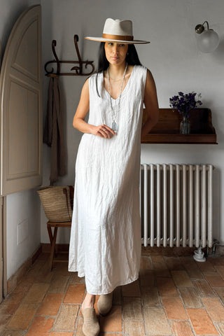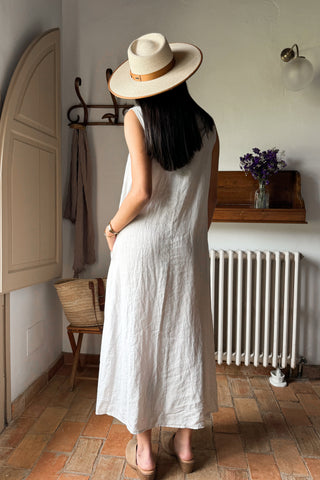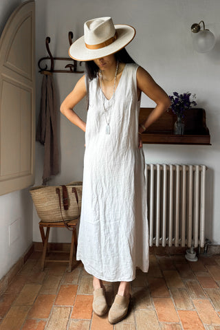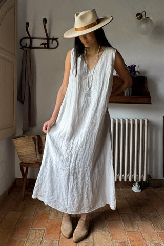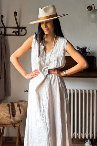 Yksinkertaisen tyylikäs hillitysti A-linjainen pellavamekko hurmaa ajattomalla ilmeellään ja kevyellä, luonnollisella tuntumallaan. Mekko on valmistettu laadukkaasta, pehmeästä pellavasta, joka laskeutuu kauniisti ja hengittää miellyttävästi myös kuumina päivinä. V-pääntie ja hihaton malli antavat keveyttä ja naisellisuutta kokonaisuuteen.