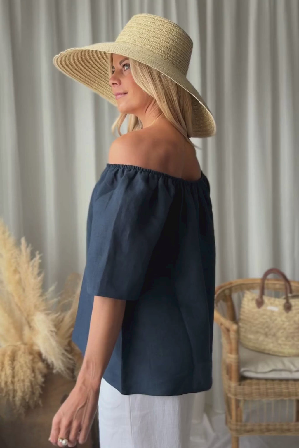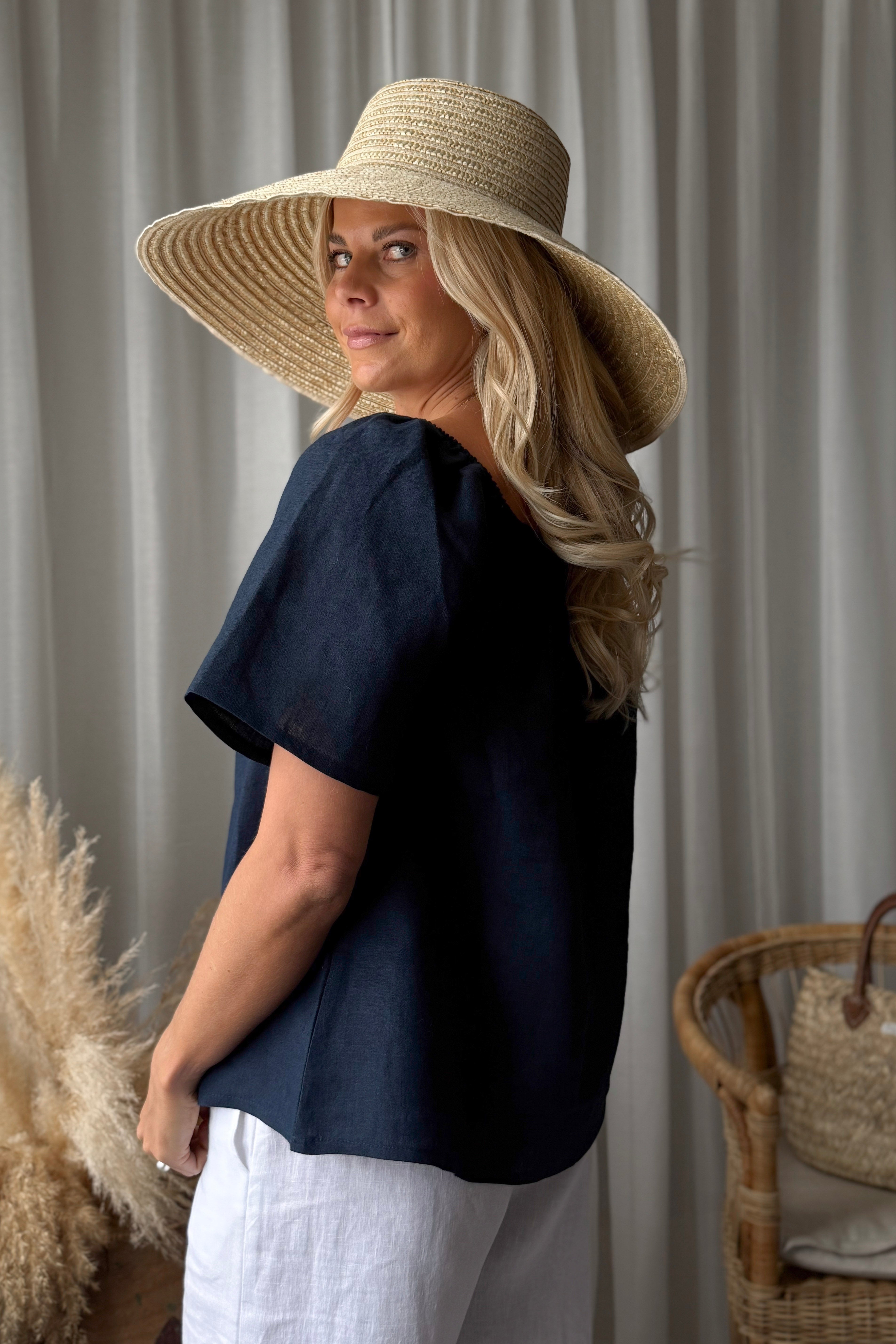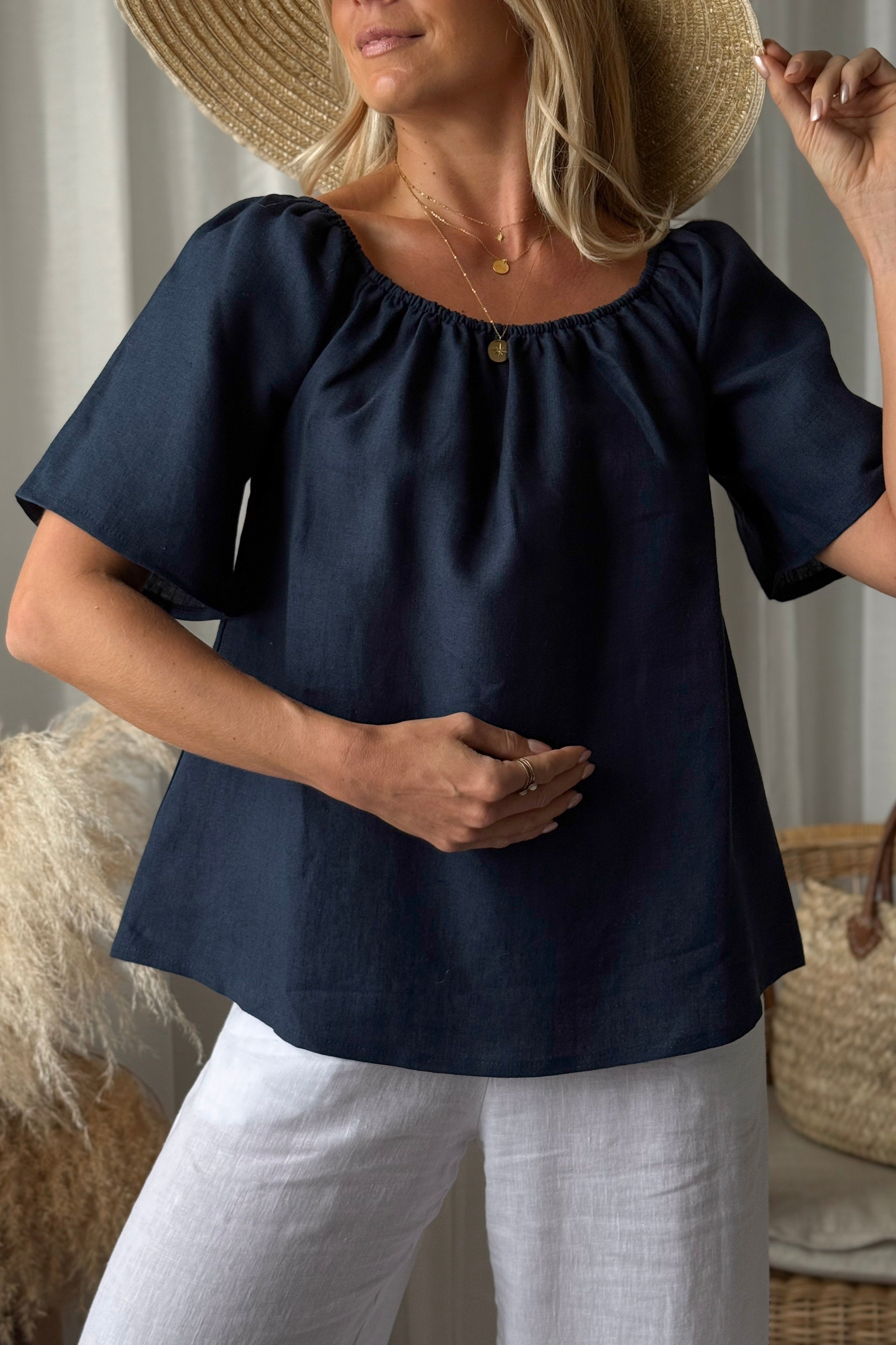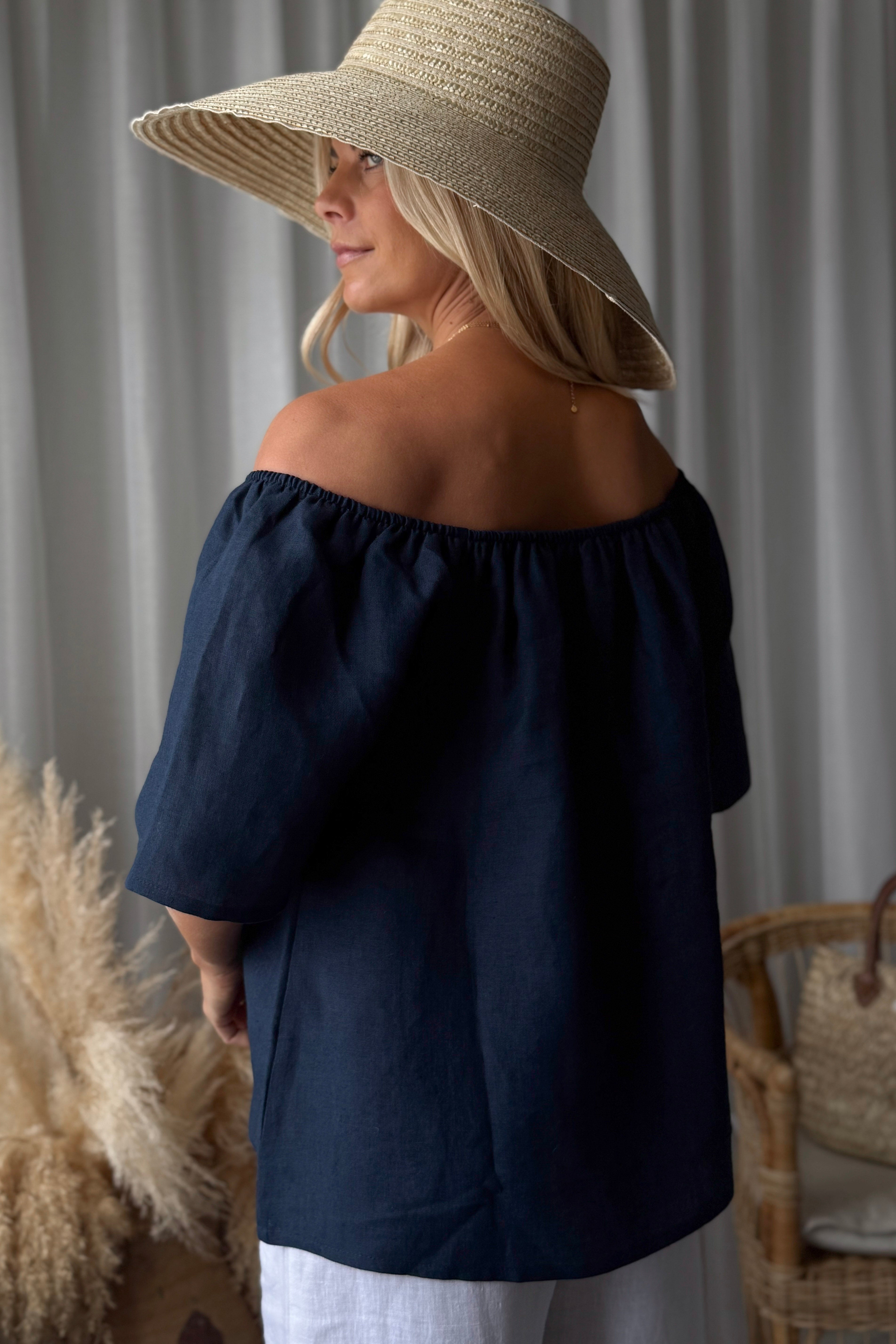 Ihanan ilmava pellavainen off the shoulder -paita A-linjaisella mallilla. Puolimittaiset, väljät ja hieman levenevät hihat. Kevyt ja kauniisti laskeutuva, helppo valinta kesäisiin asukokonaisuuksiin.