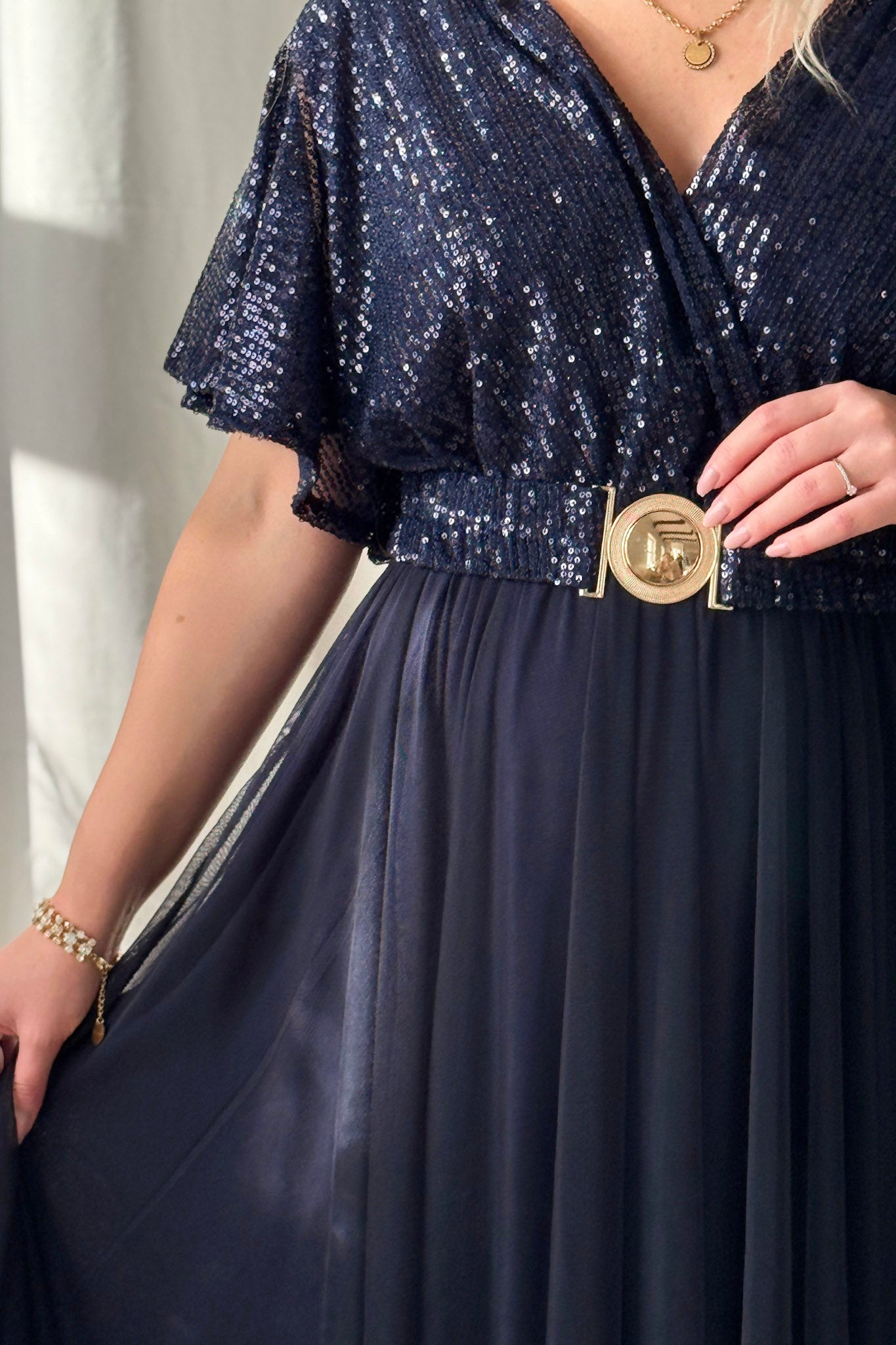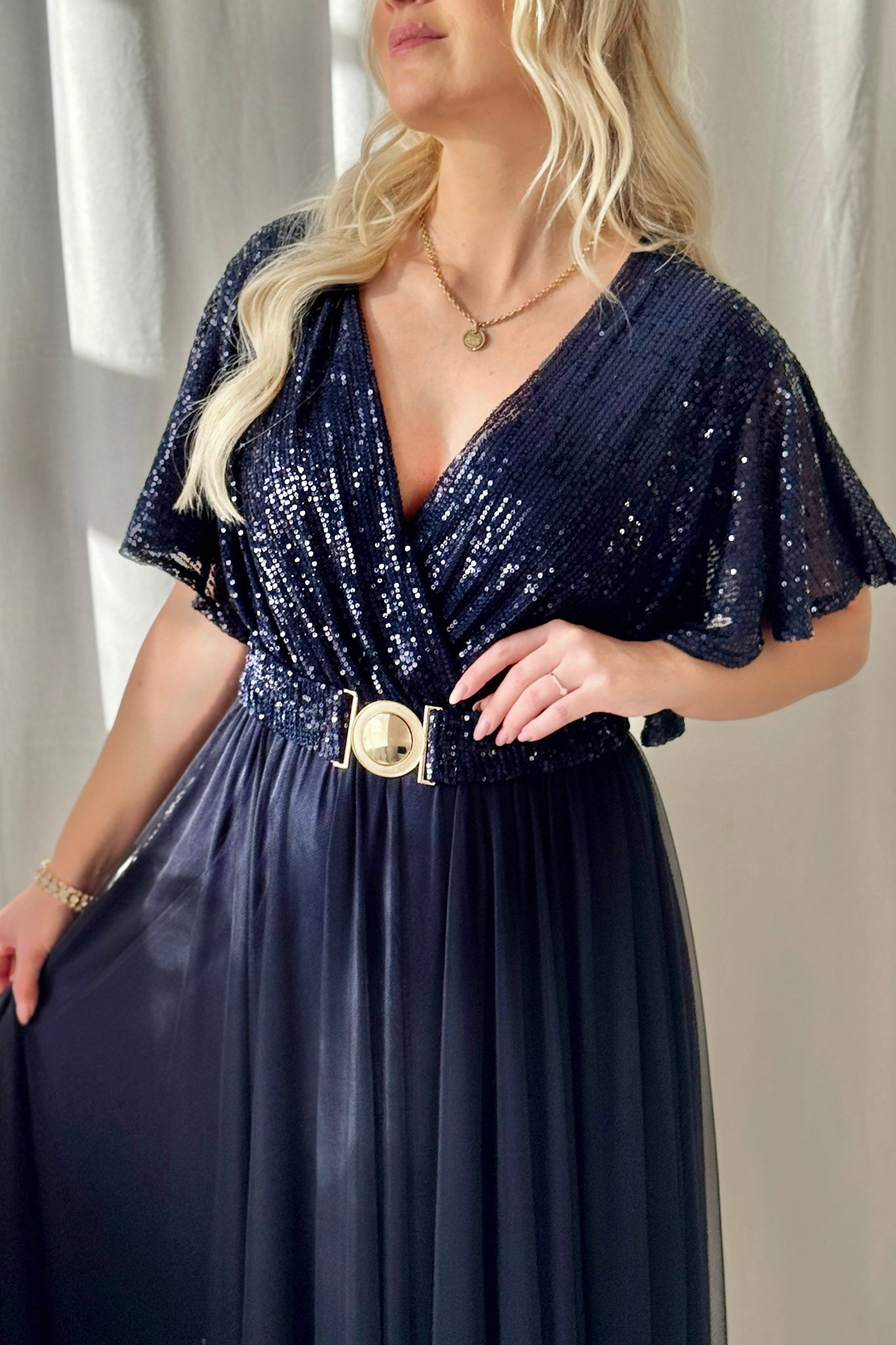 It's time to glow! Huikaisevan kaunis mekko jossa paljetti yläosa, kietaisumalli ja perhosmaiset hihat. Helma on hulmuavaa sifonkia jossa lyhyempi alushame. Imarteleva malli myös muodokkaalle, joustava kuminauha rinnan alla ja joustovyö.
