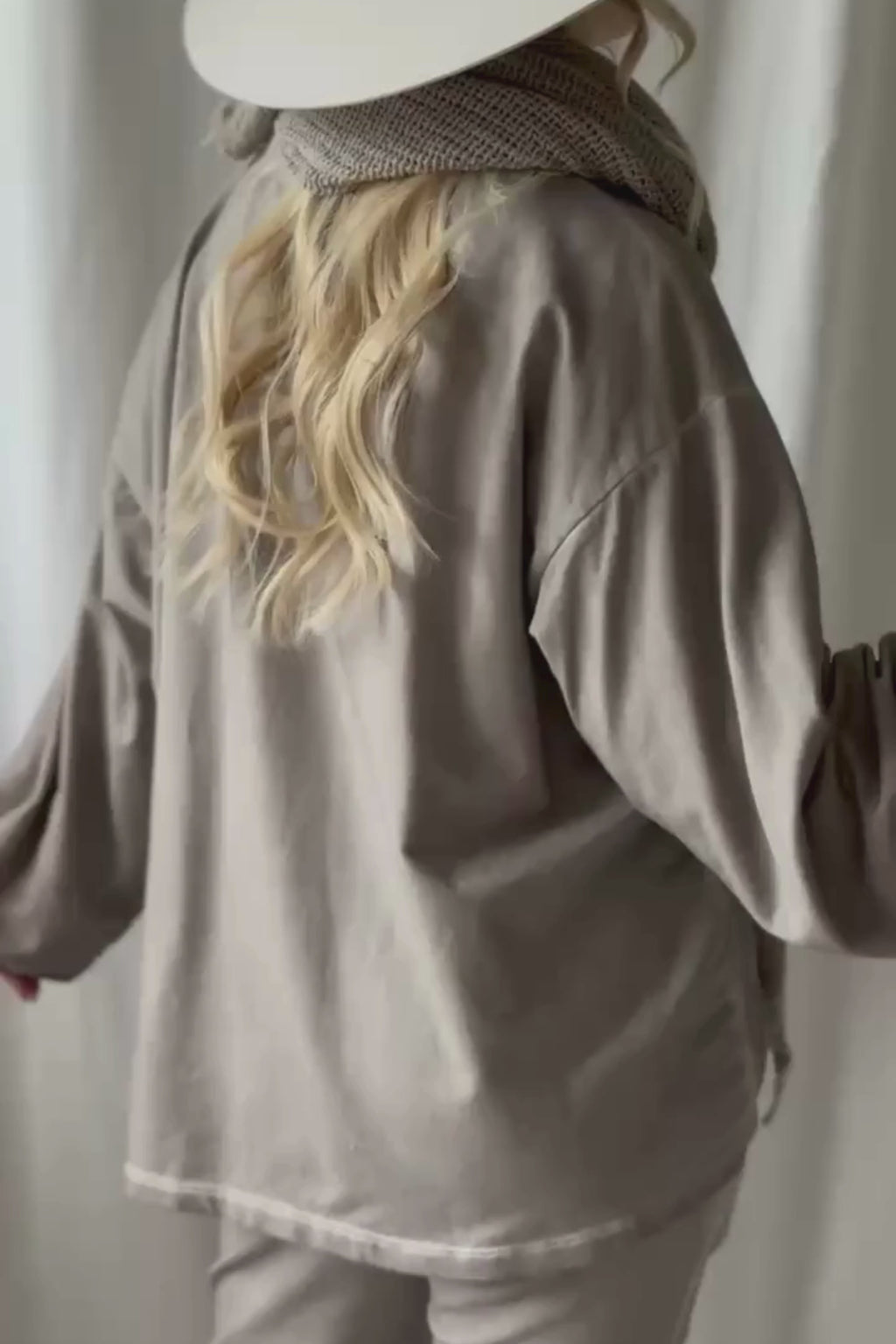 Tämä collegepaita pyöreällä kaula-aukolla on suunniteltu tuomaan arkeen pehmeyttä, mukavuutta ja rentoa tyyliä. Materiaali tuntuu miellyttävältä ihoa vasten. Edestä hieman lyhyempi ja takaa pidempi leikkaus luo rennon, laskeutuvan ilmeen ja tekee paidasta helpon yhdistää erilaisiin alaosiin. Väljät hihat, madalletut olkapäät sekä hihojen rypytykset viimeistelevät huolettoman ja modernin ilmeen.