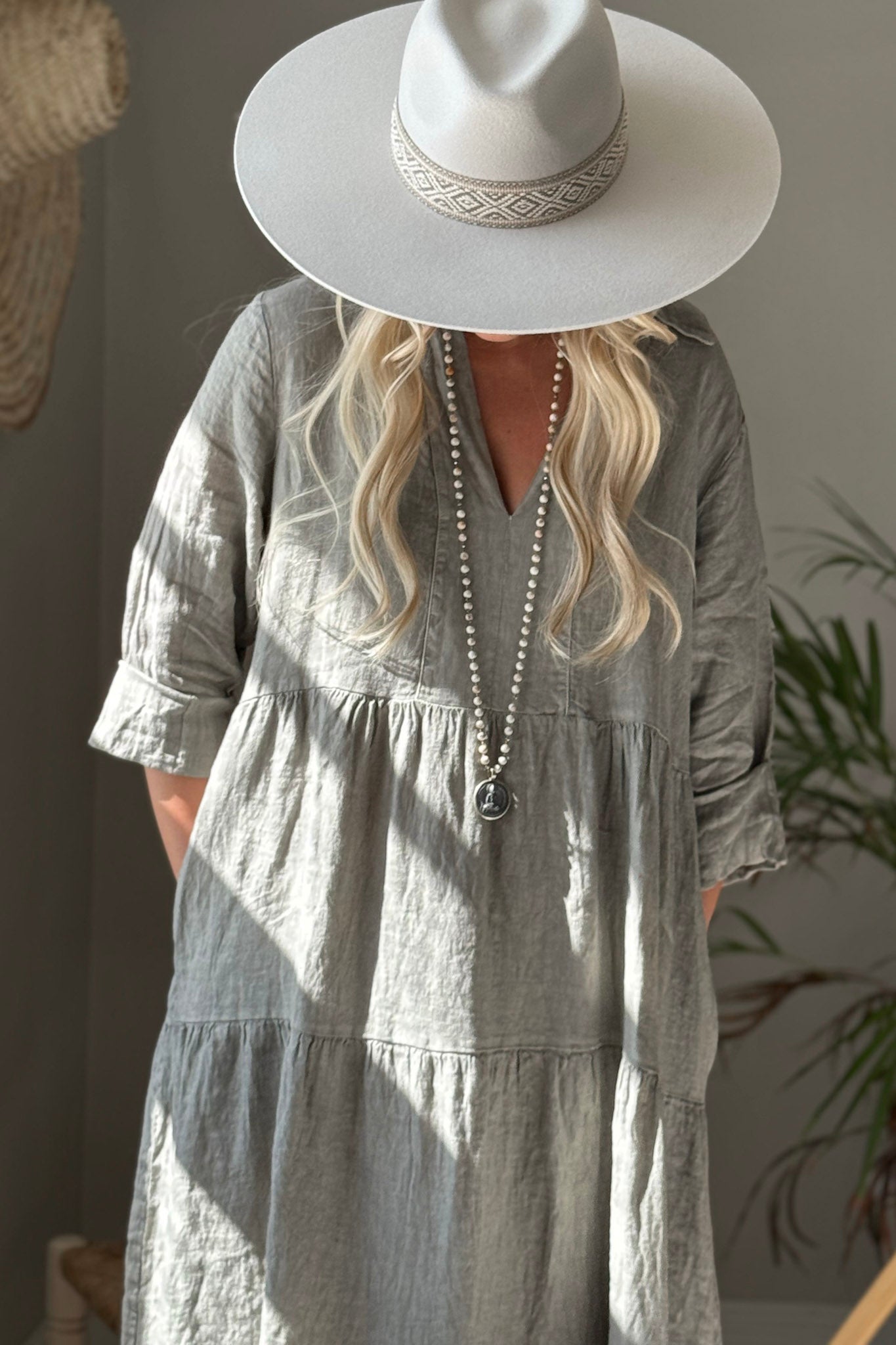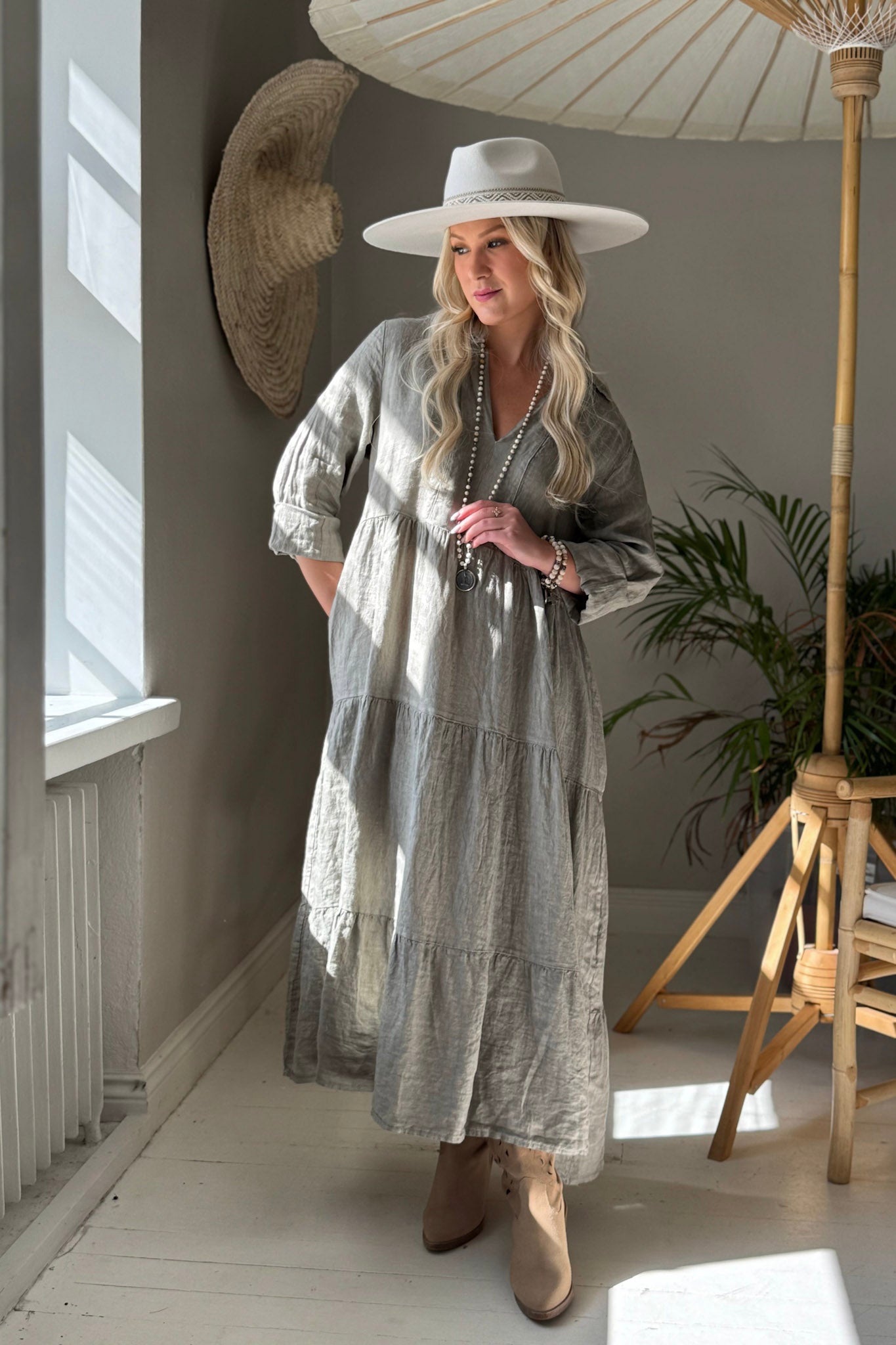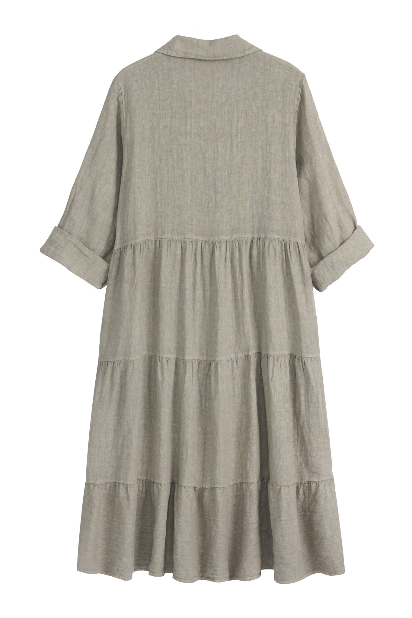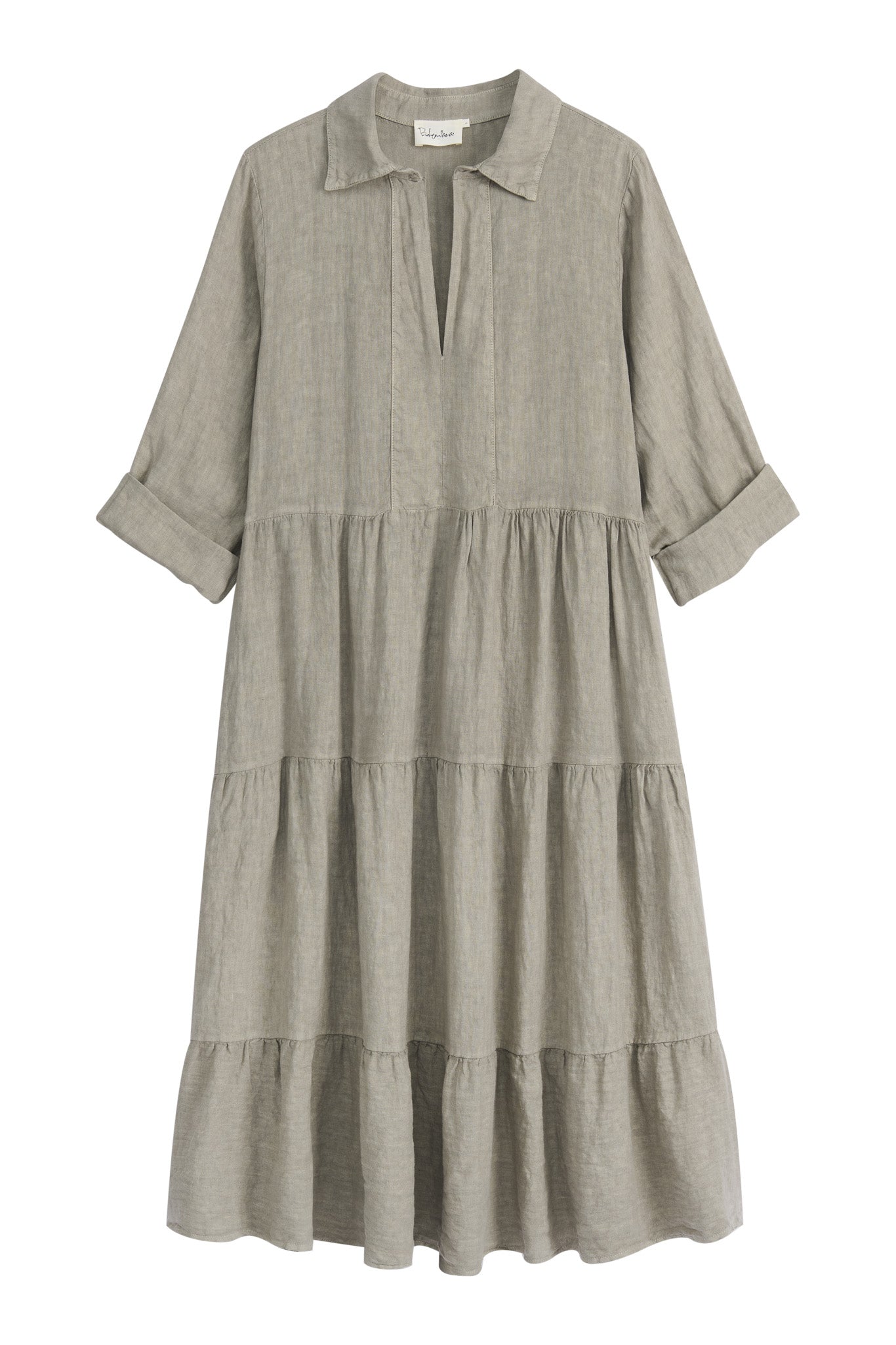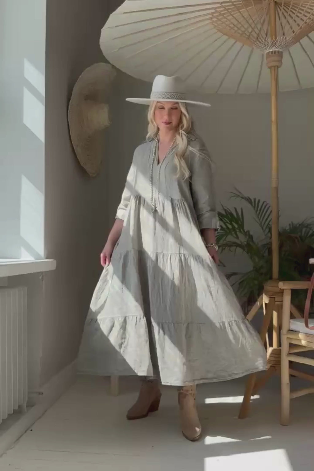 Upea, A-linjainen pellavamekko, jossa V-pääntie ja kaulukset. Runsaat frillat kolmessa kerroksessa tuovat mekkoon näyttävyyttä. Suorat hihat.