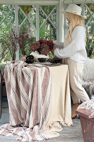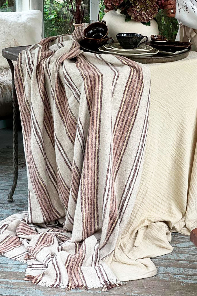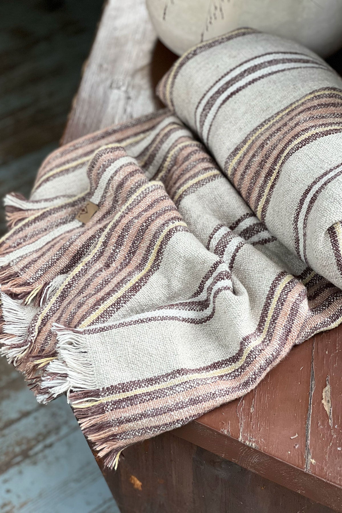 Kaunis raidallinen viltti, jota voi käyttää myös pytäliinana.