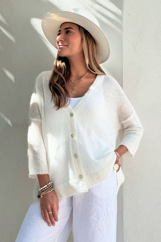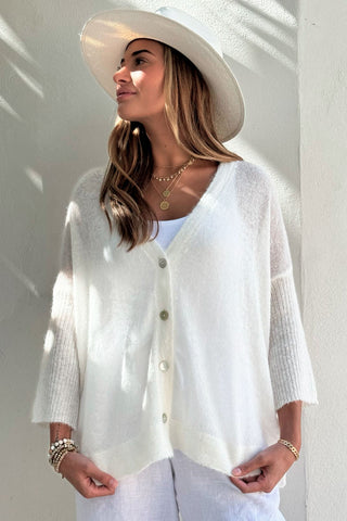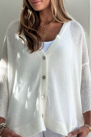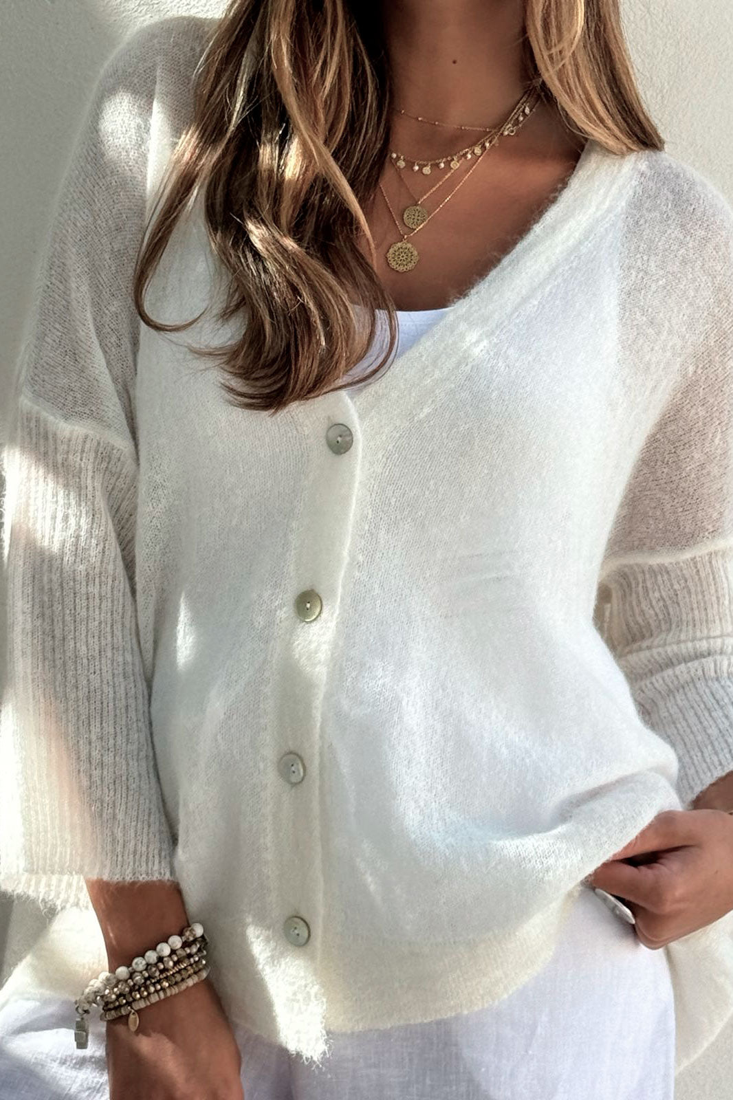 Henkäyksen kevyt ja pehmeä neuletakki ylellistä alpakkaa. Lyhyt ja väljänmallinen, jossa helmiäisnapit. Yhdistä saman sarjan ylellisen pehmeään Adams-alpakkahuiviin.