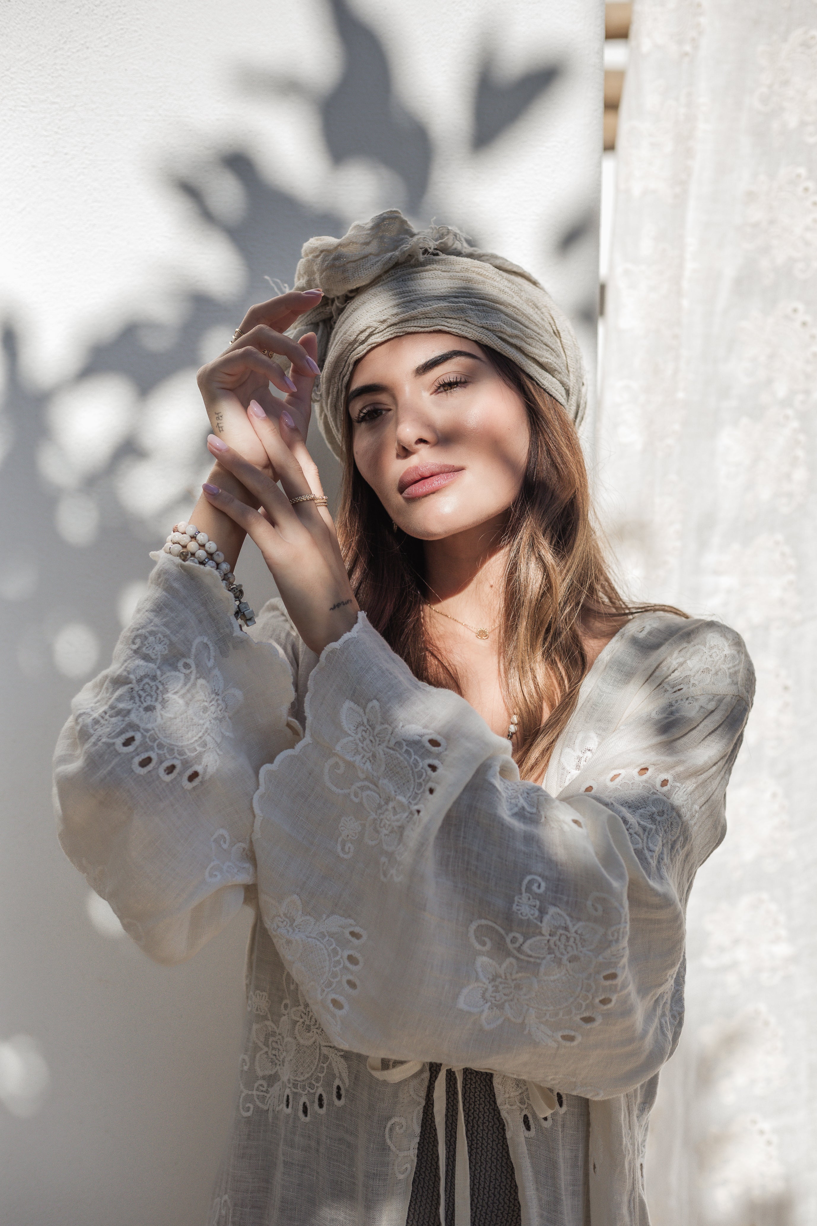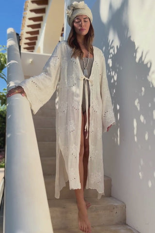 Kaunis ja kevyt solmittava kimono brodeeratusta pellavasta. Leveät hihat aaltoilevalla reunalla. Helmassa aaltoilevat reunat sekä sivuissa halkiot.