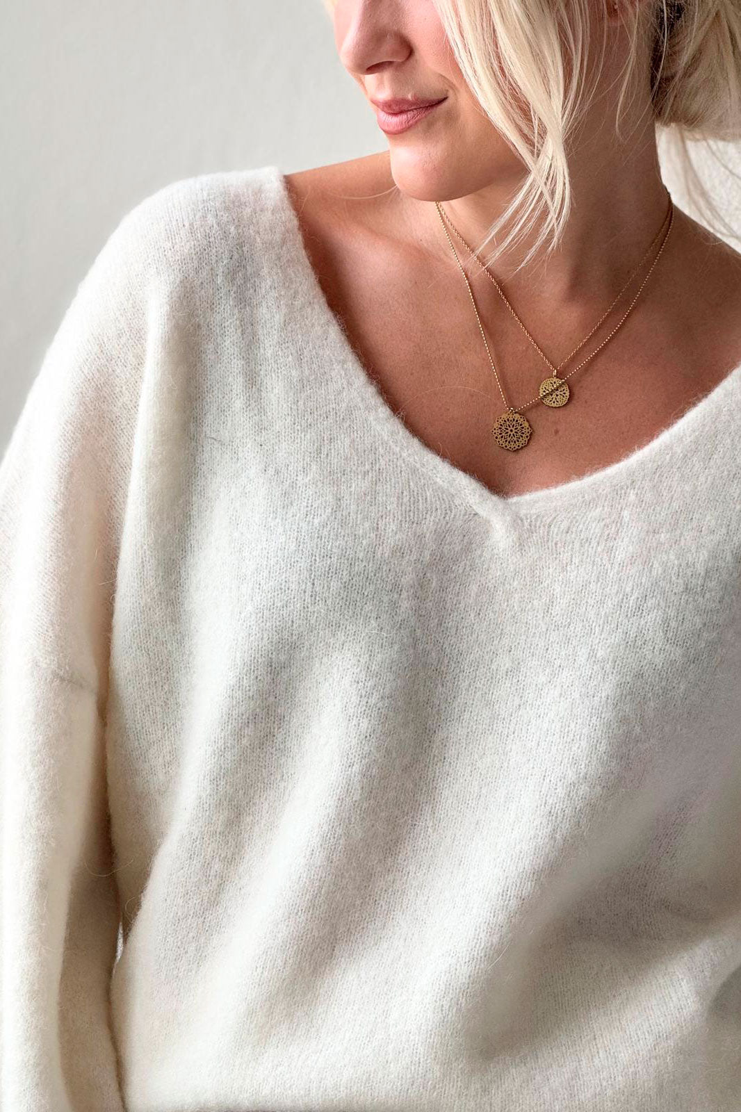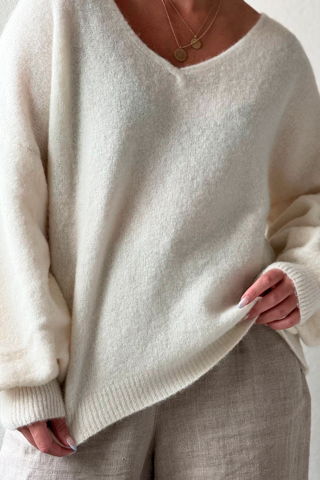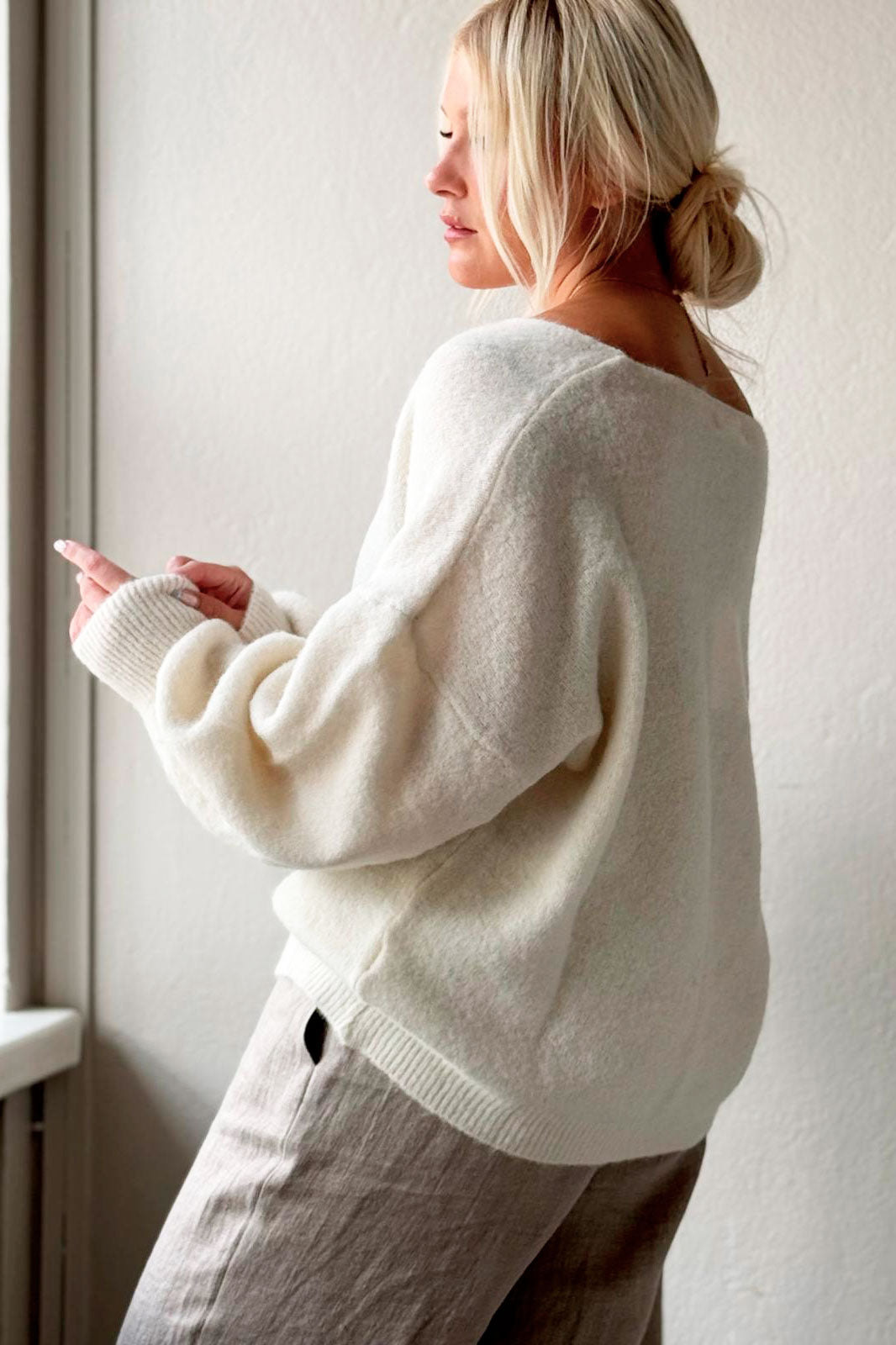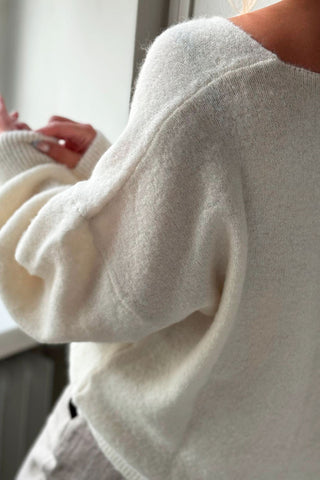 Ylellisen tuntuinen ja kutisematon neule, jossa runsaasti alpakanvillaa. Venyvä ja joustava, pussimaiset hihat ja riittävästi mittaa hihoissa, pituudessa pidemmillekin.