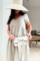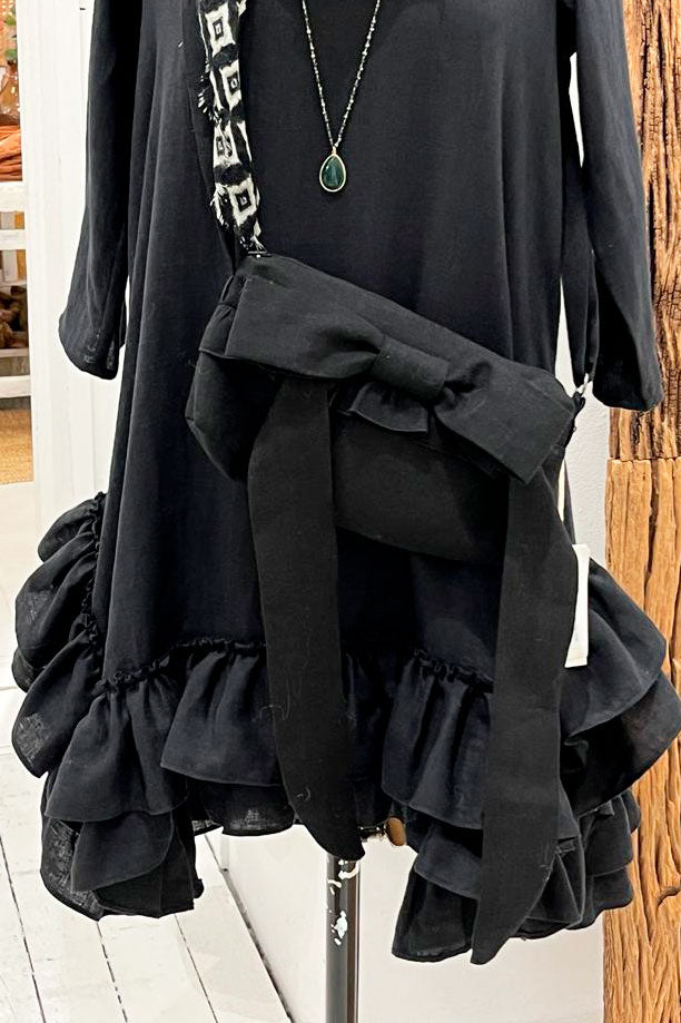 Upea pellavalaukku rusetilla. Säädettävä olkahihna, ommeltu pehmike sekä sisävuori pellavaa. Laukussa vetoketju.