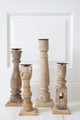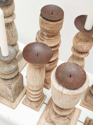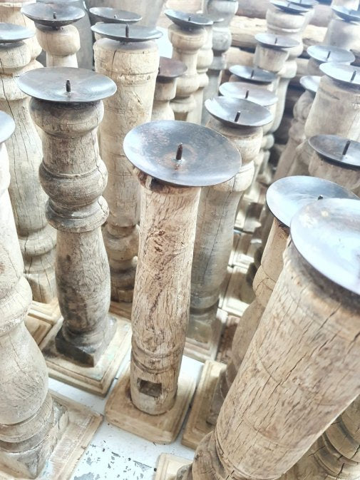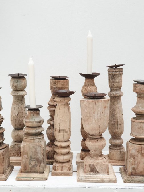 Vanhasta pöydänjalasta tehty kynttilänjalka vaaleaa puuta. Käsin kaiverretut yksirtyiskohdat. Korkeus 25-32cm. Ensimmäisessä kuvassa kaksi etummaista kynttilänjalkaa ovat kokoa M.