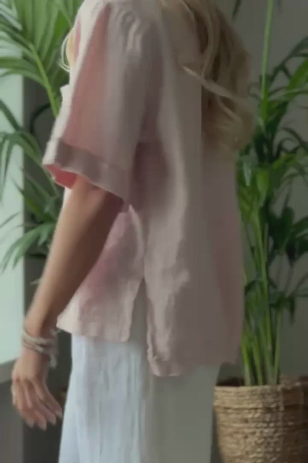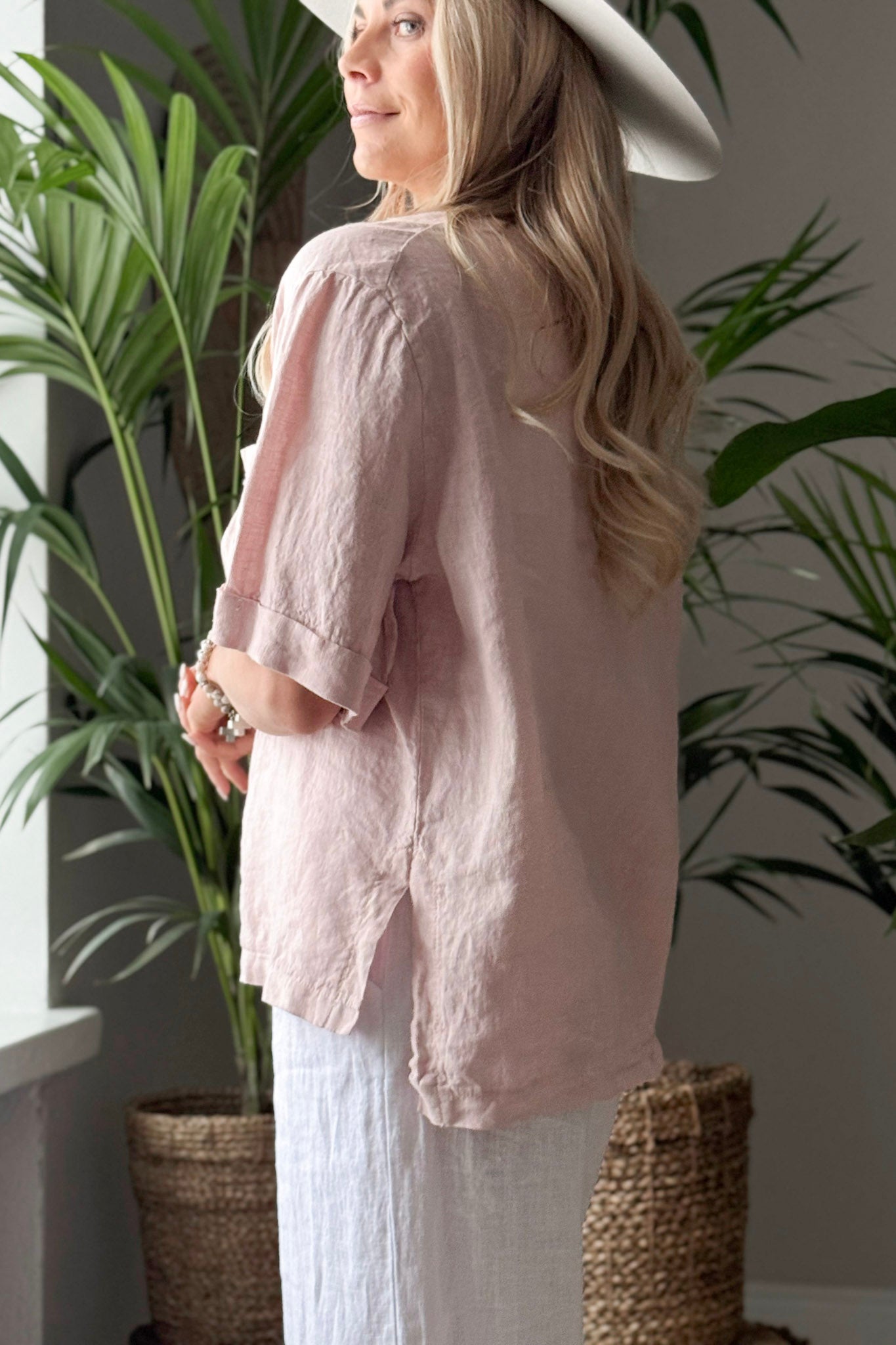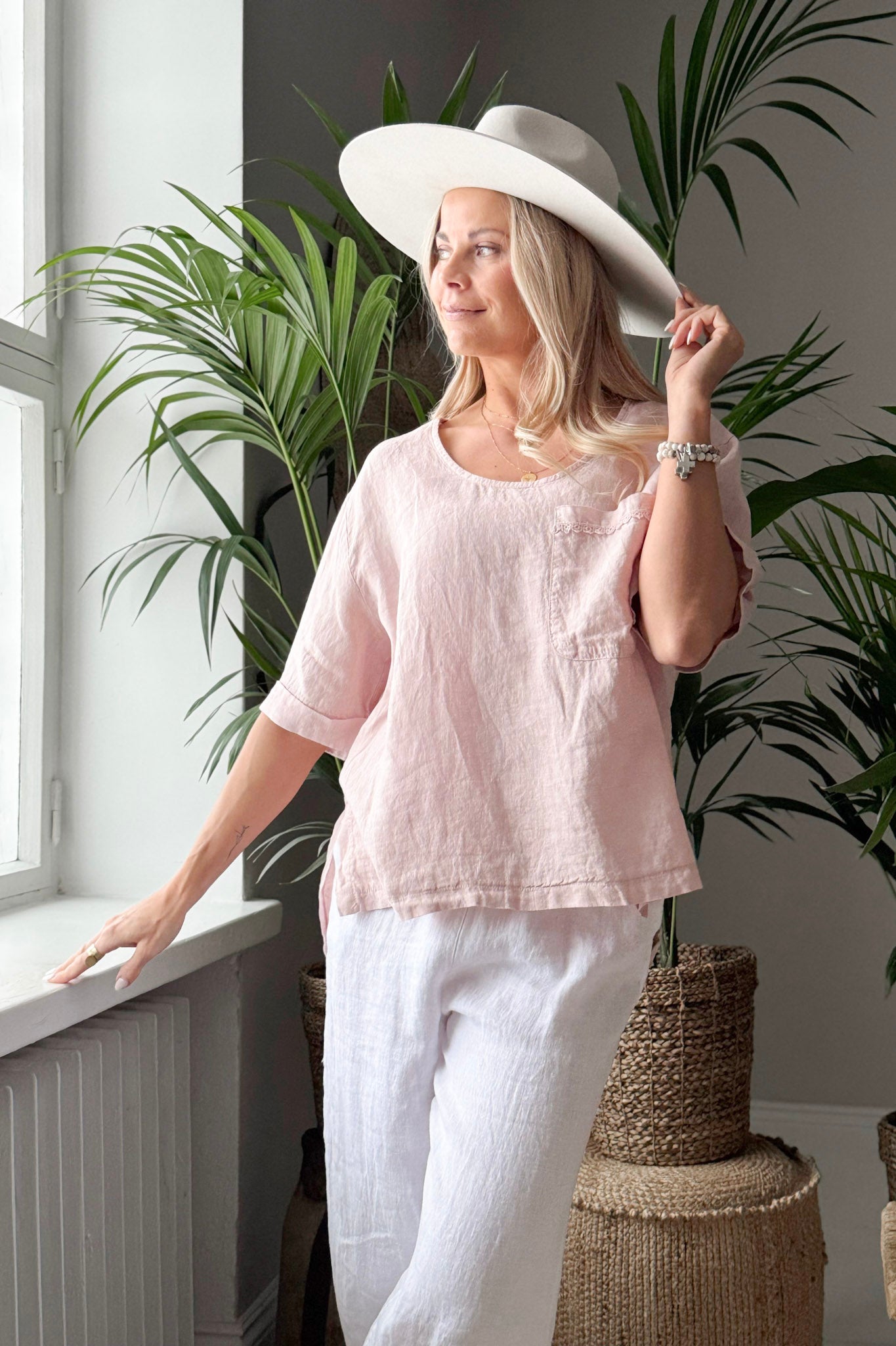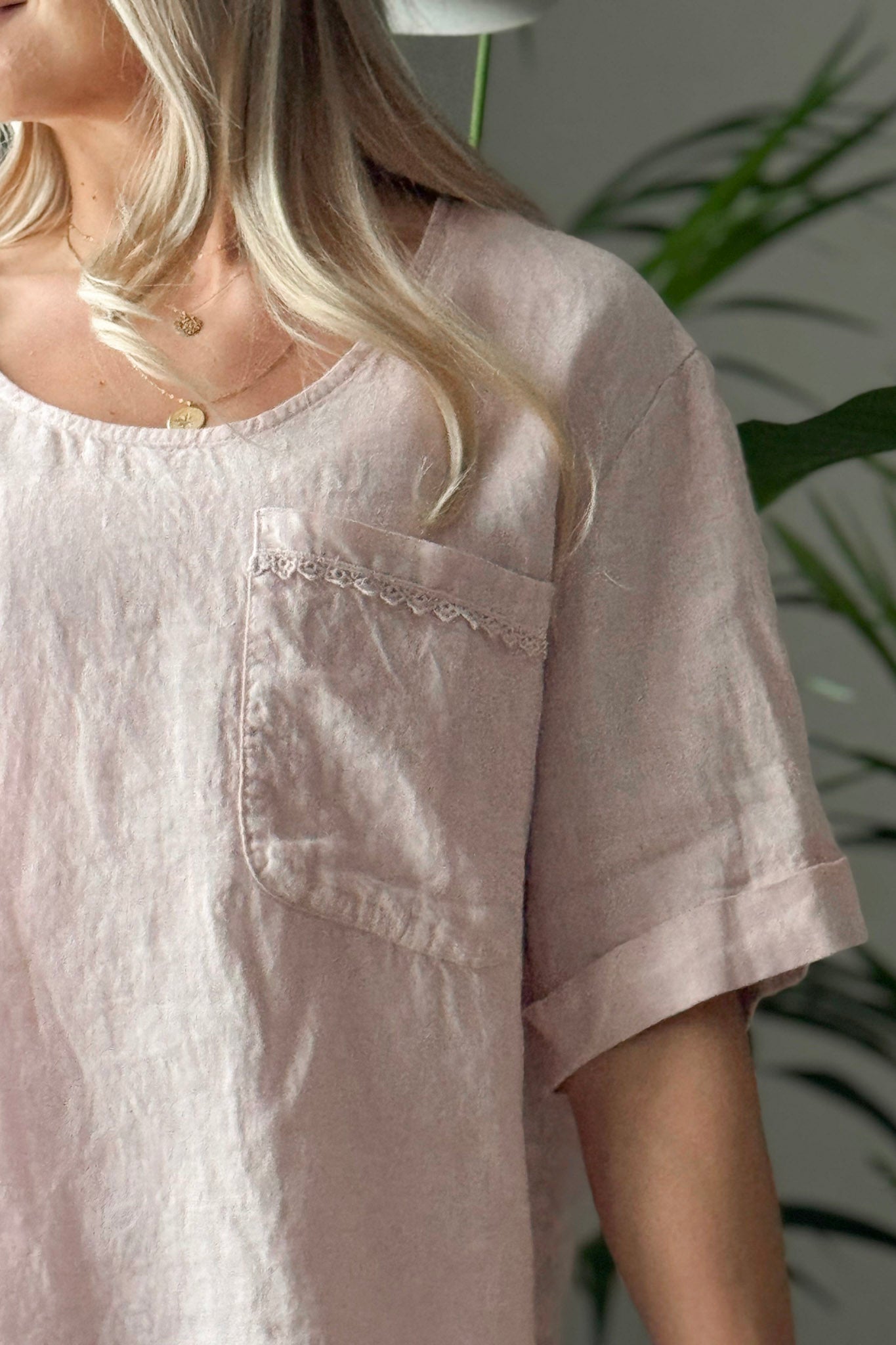 Rento ja ajaton pellavapaita, jossa yhdistyvät mukavuus ja kauniit yksityiskohdat. Etupuolen rintataskua koristaa hienovarainen kapea pitsinauha, joka tuo ilmeeseen pehmeyttä. Pyöreä kaula-aukko ja puolimittaiset, kevyesti käärityt hihat luovat huolettoman ja rennon kokonaisuuden. Sivujen halkiot lisäävät liikkumavapautta ja keventävät ilmettä, ja hieman pidempi takaosa tuo paidalle kauniin laskeutuvuuden.