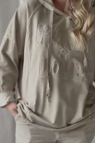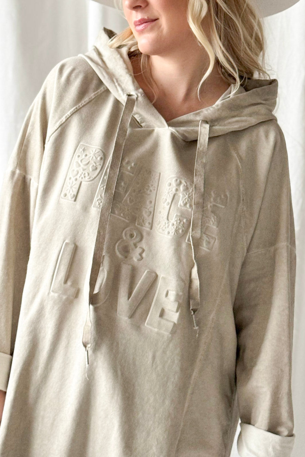 Mukava huppari, joka on valmistettu pehmeästä ja miellyttävästä materiaalista. Madalletut olkapäät korostavat rentoa ilmettä, ja hihansuissa olevat käännökset tuovat viimeistellyn yksityiskohdan. Edestä hieman lyhyempi ja takaa pidempi leikkaus luo kauniisti laskeutuvan, rennon siluetin. Sopii täydellisesti arkeen ja rentoon tyyliin.