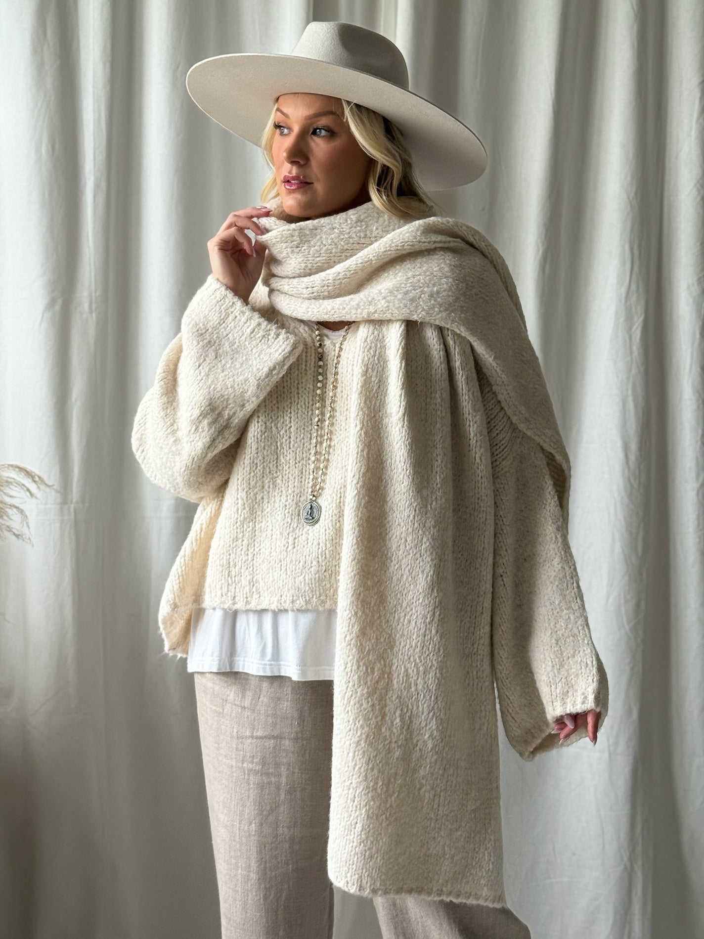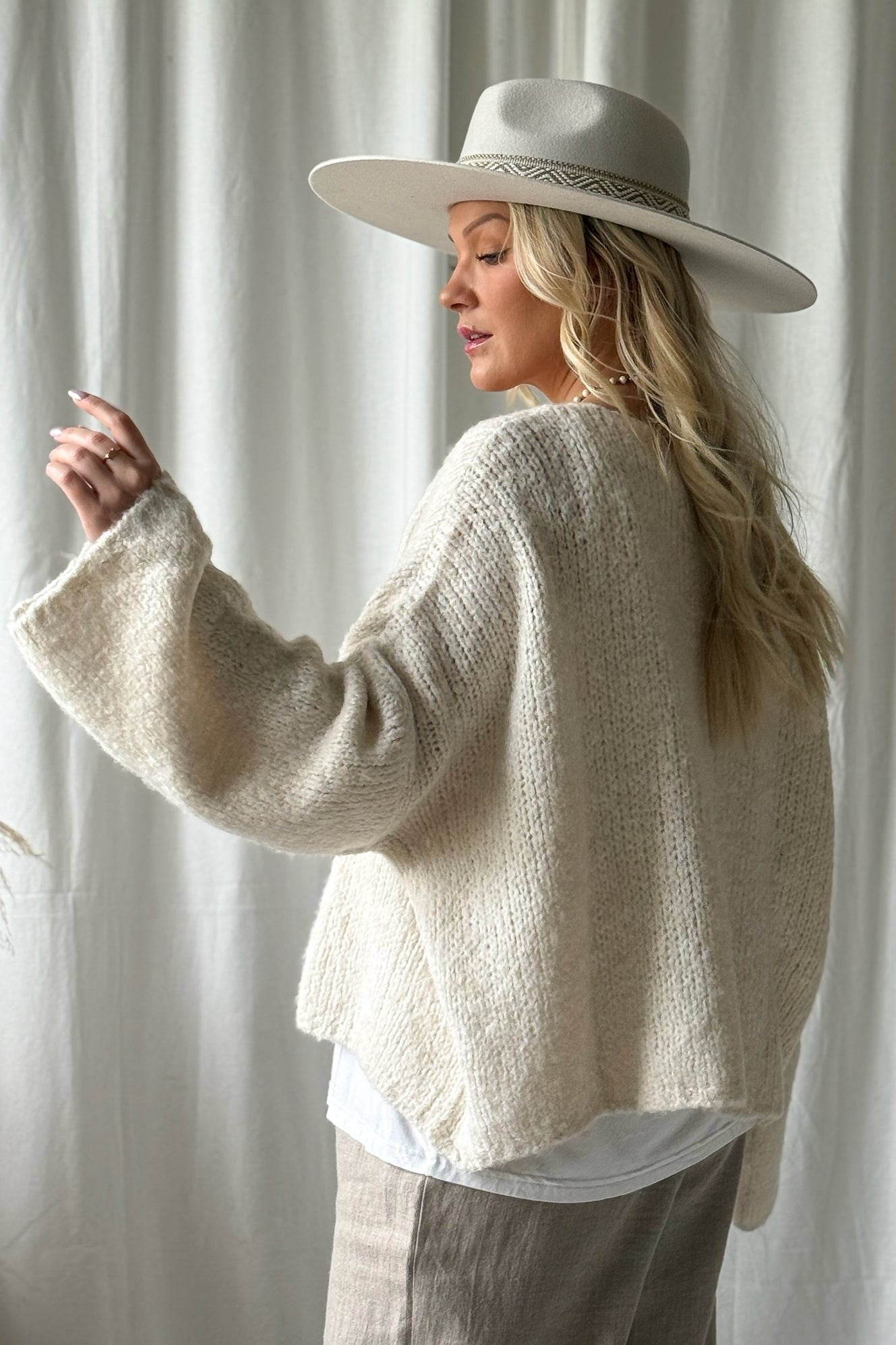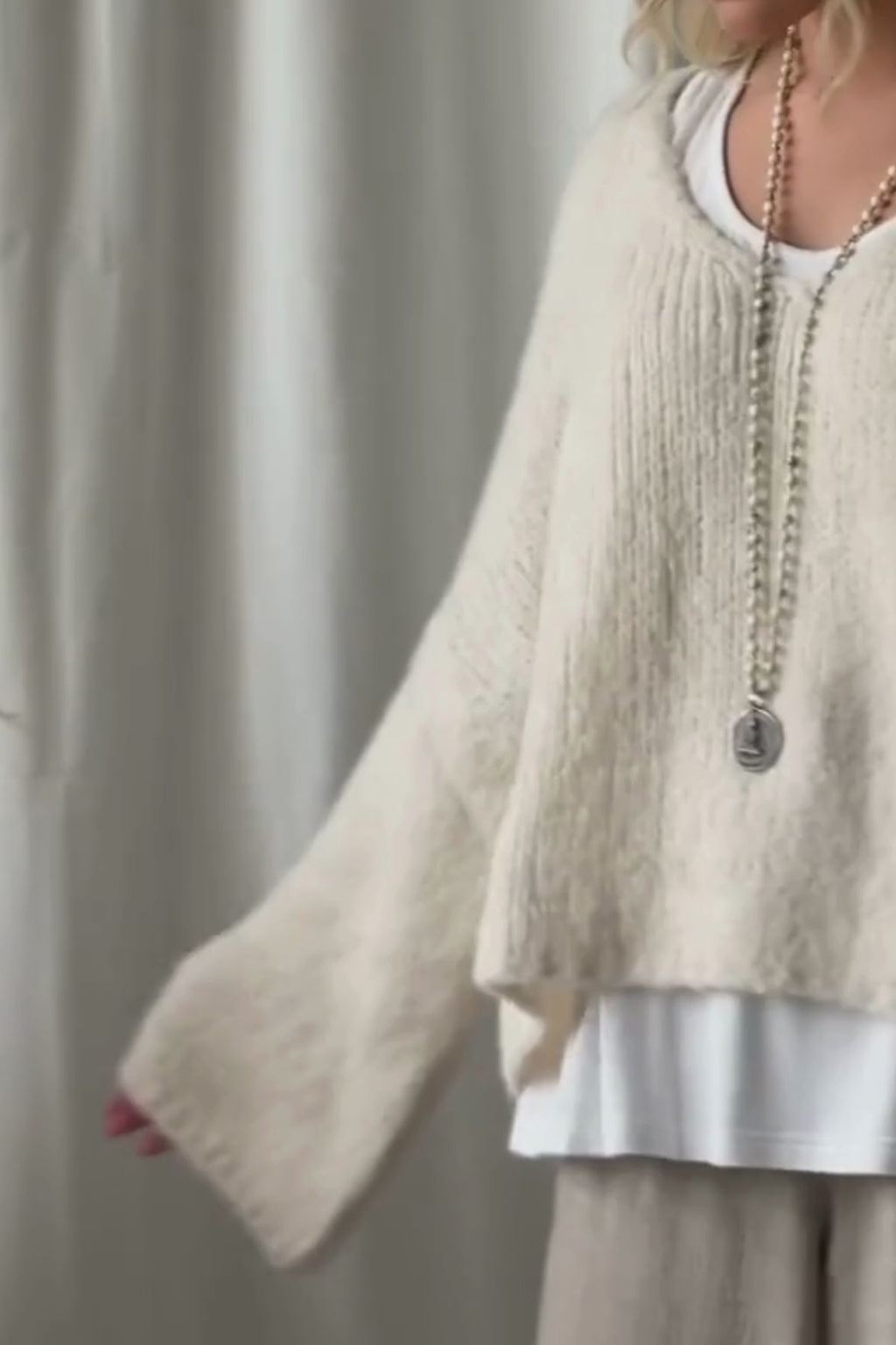 Bouckle-malliston muhkea ja reilu neule v-kauluksella. Neuleessa madallettu olkapäälinja, hieman pussitetut hihat sekä hihansuissa ja helmassa kevyt resori. Bouckle-neuleet ovat materiaaliltaan helppohoitoisia, eivätkä kutita ihoa.