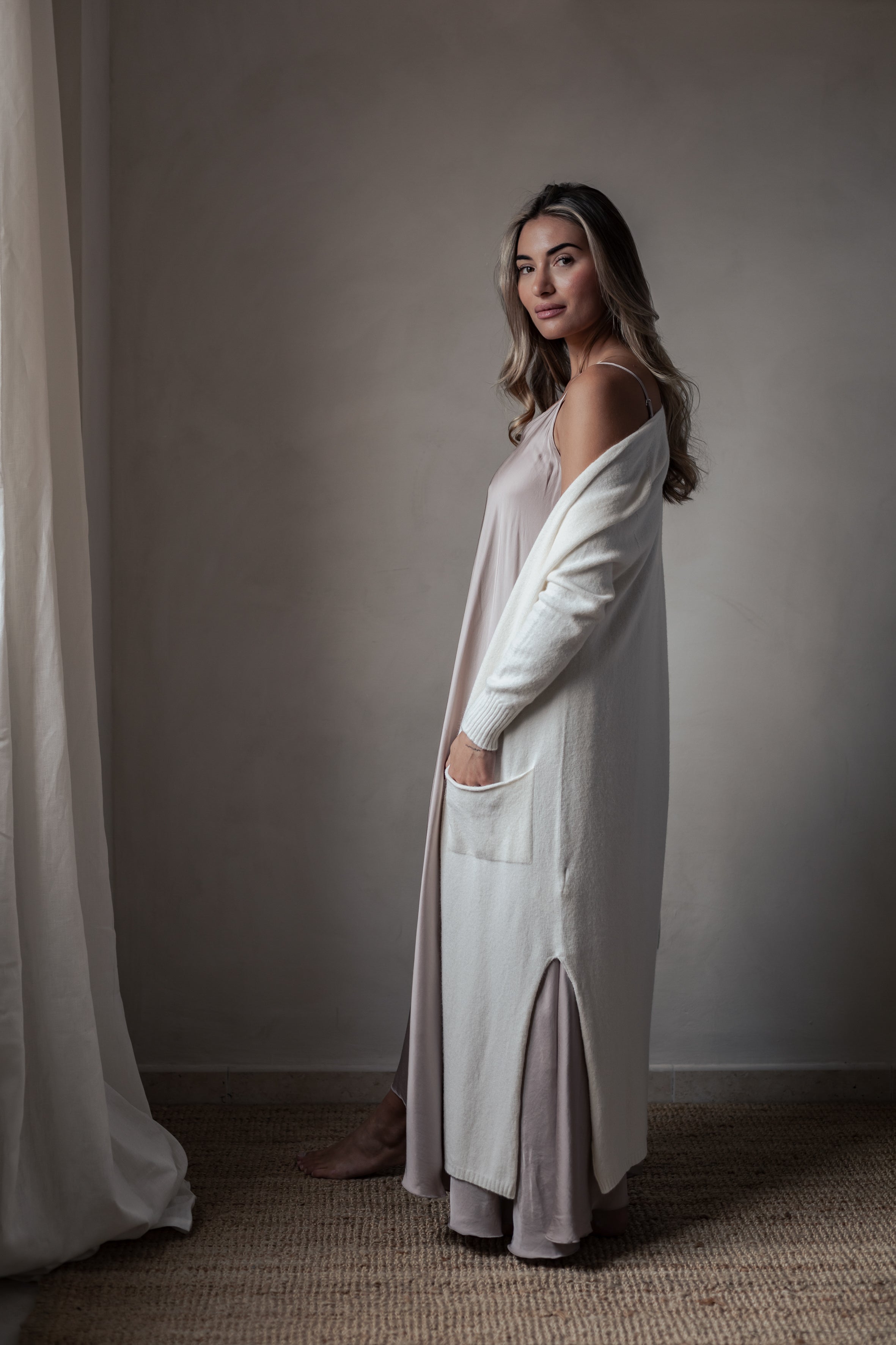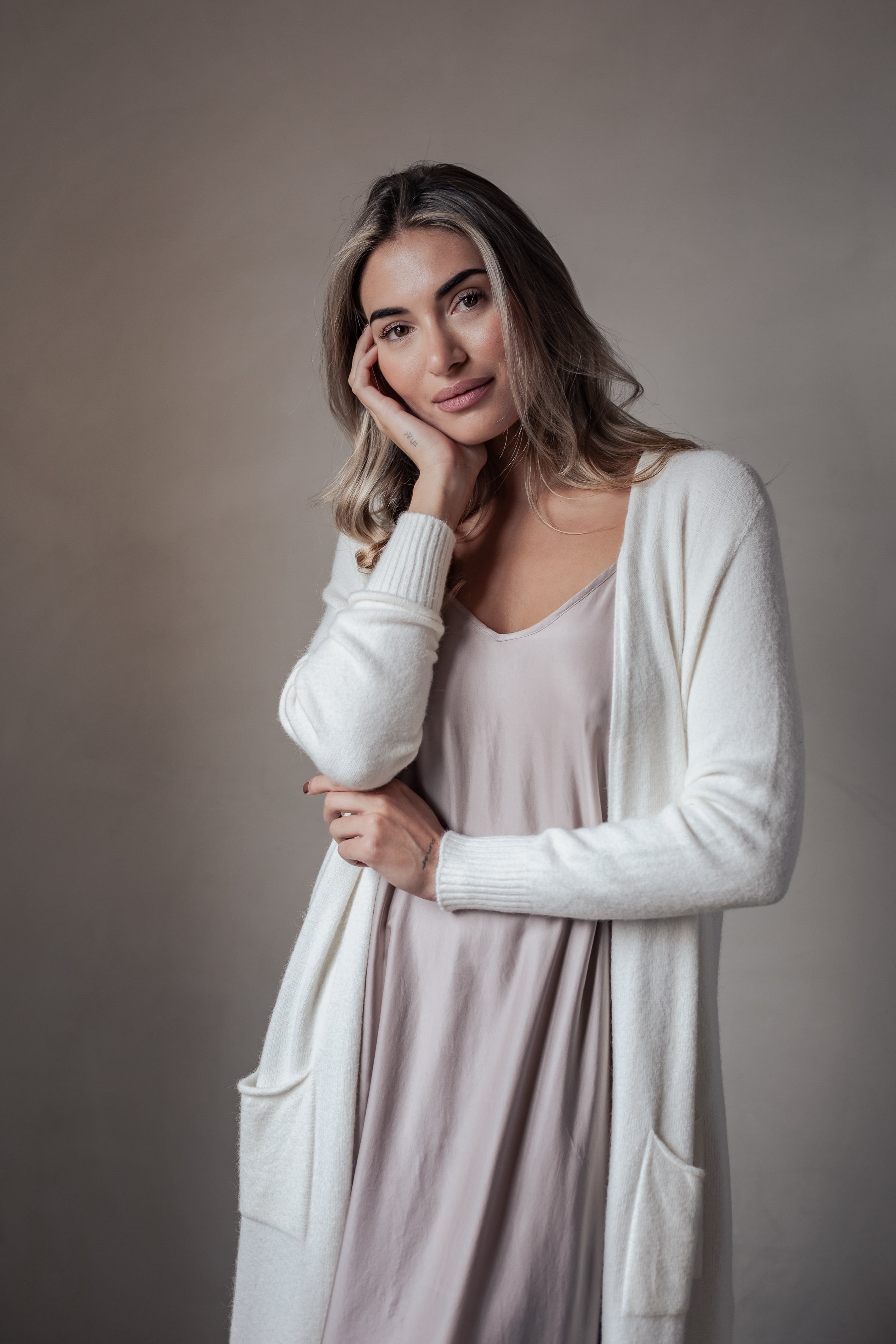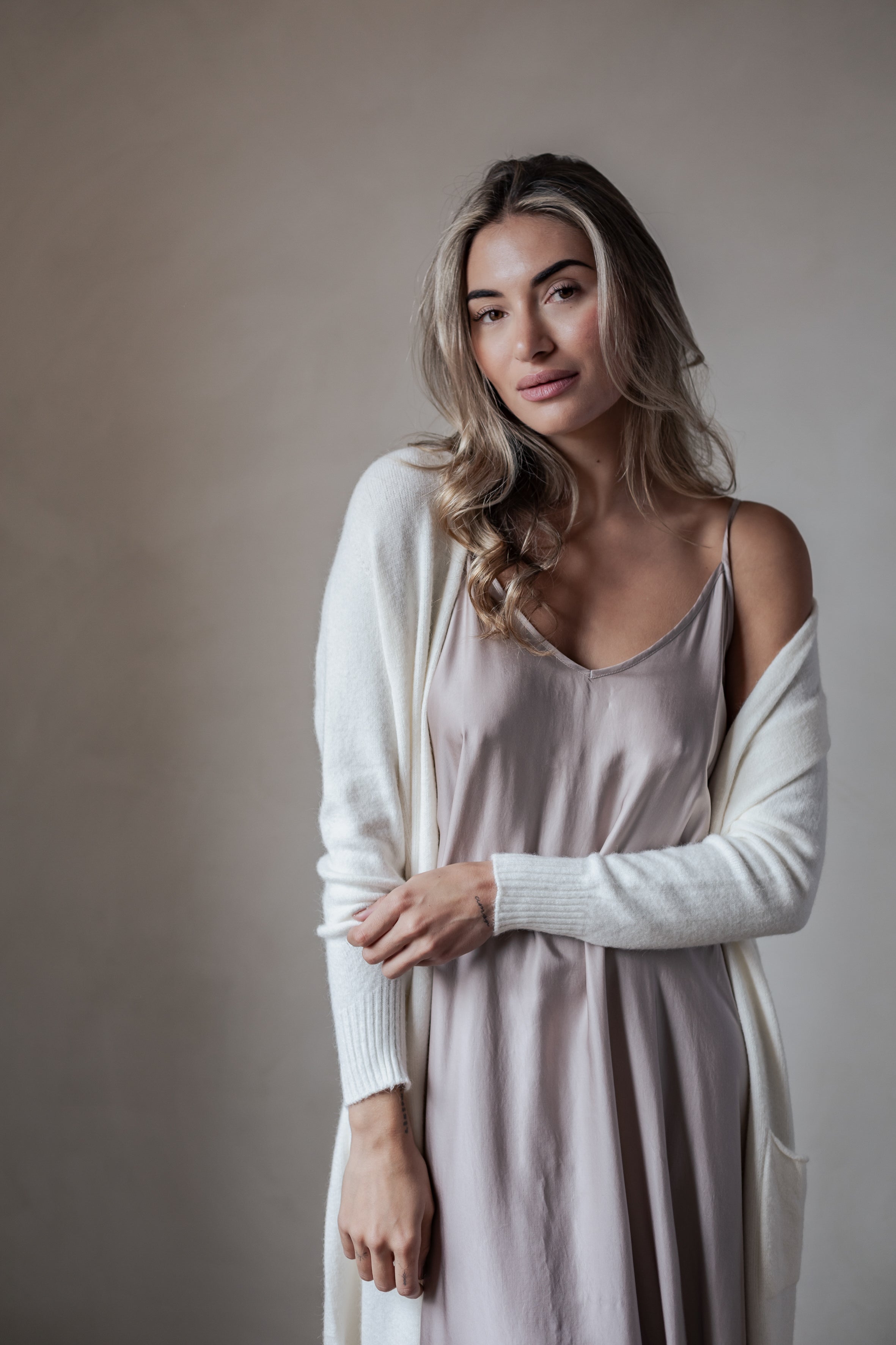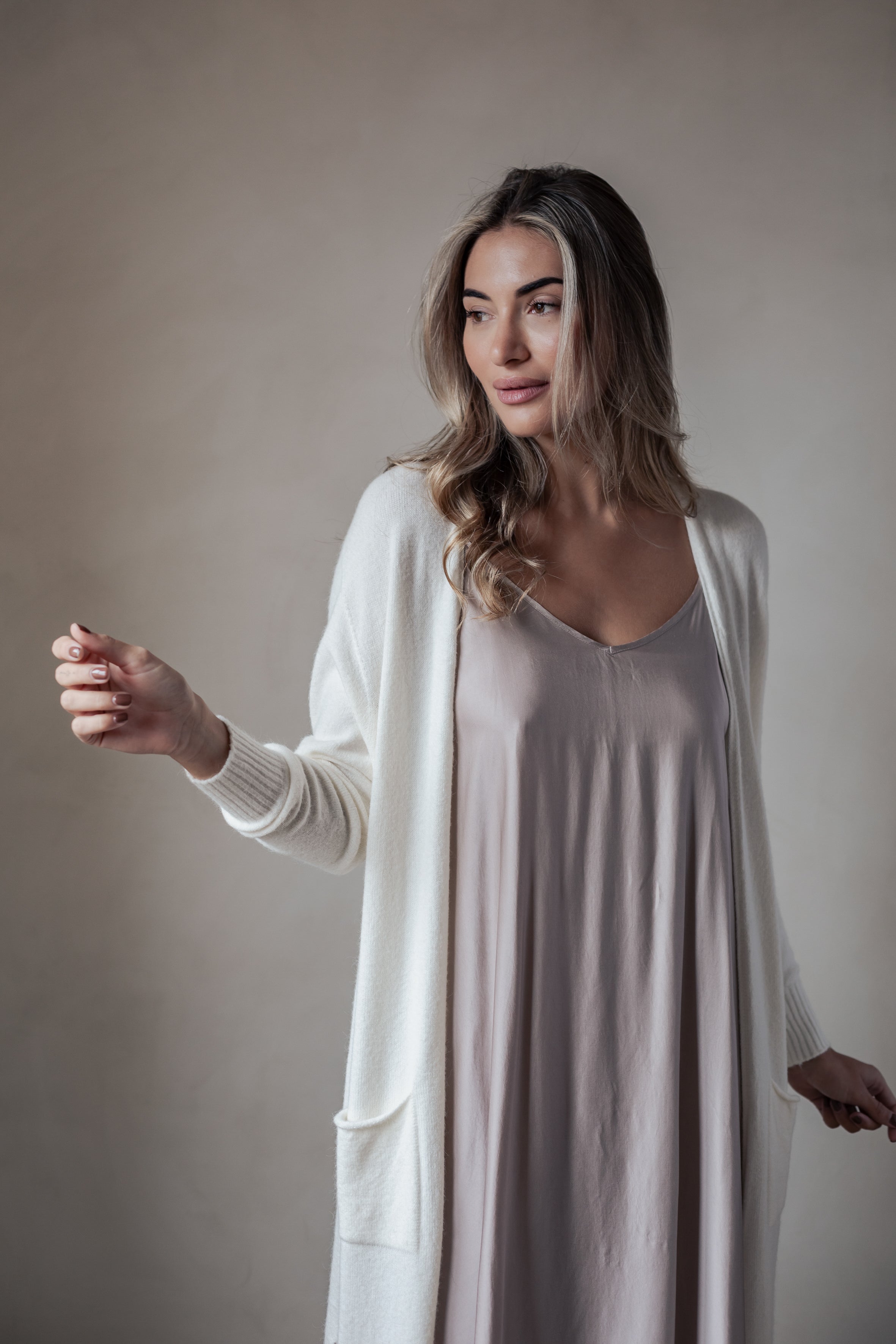 Ylellisen pehmeä ja ajattoman tyylikäs pitkä neuletakki, joka sopii täydellisesti niin arkeen kuin kerrospukeutumiseen. Edessä on kätevät taskut ja helmassa sekä hihansuissa kevyet resorit. Koko hienouden kruunaa erityinen viskoosisekoite-neuloksen materiaali.