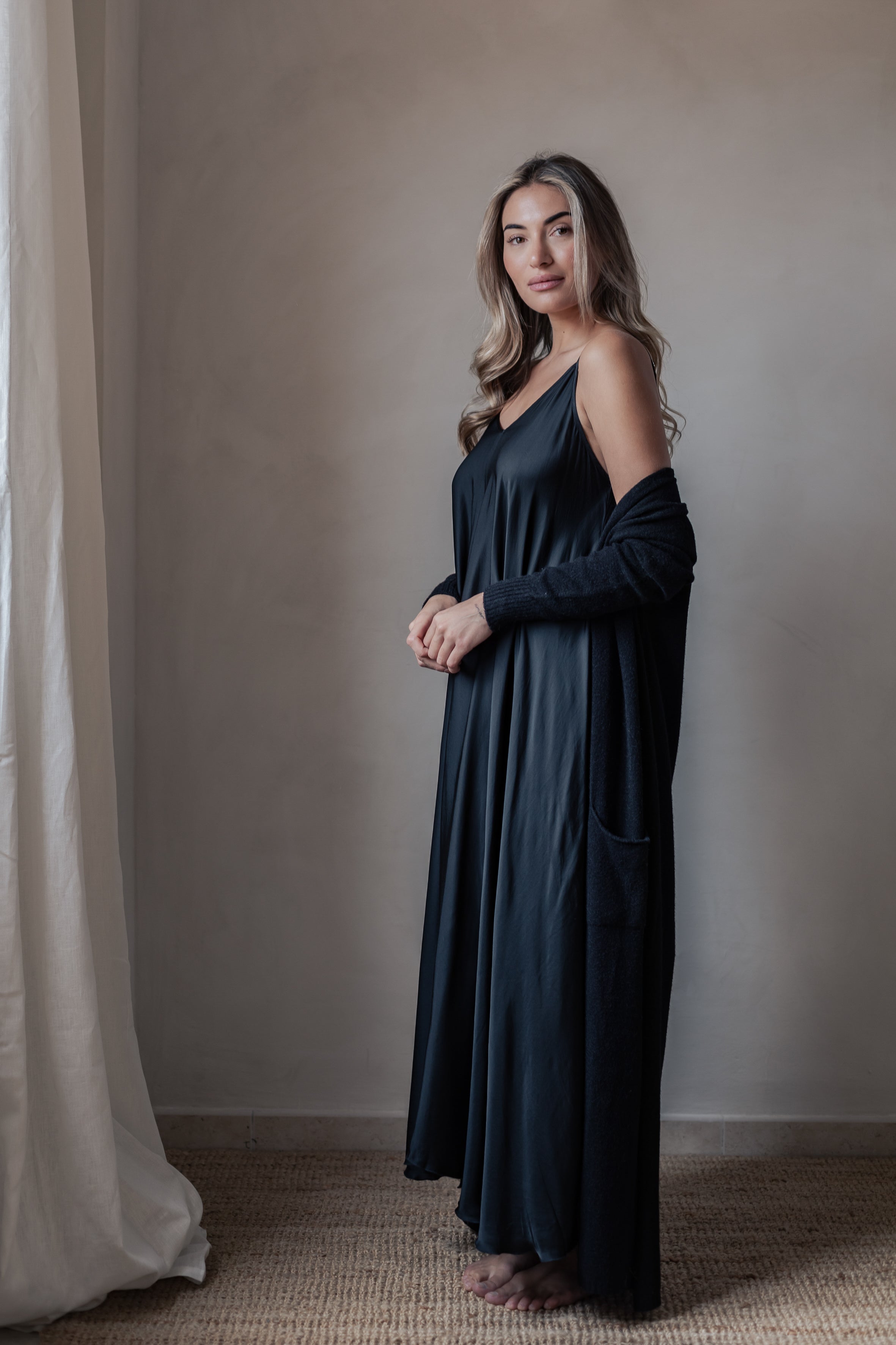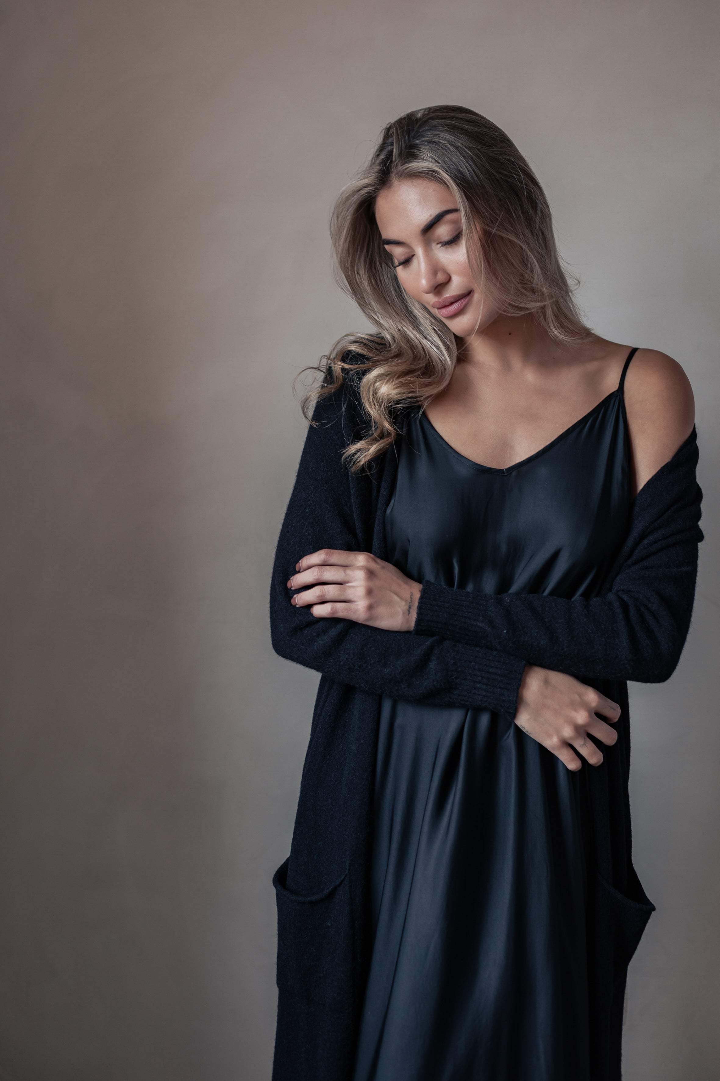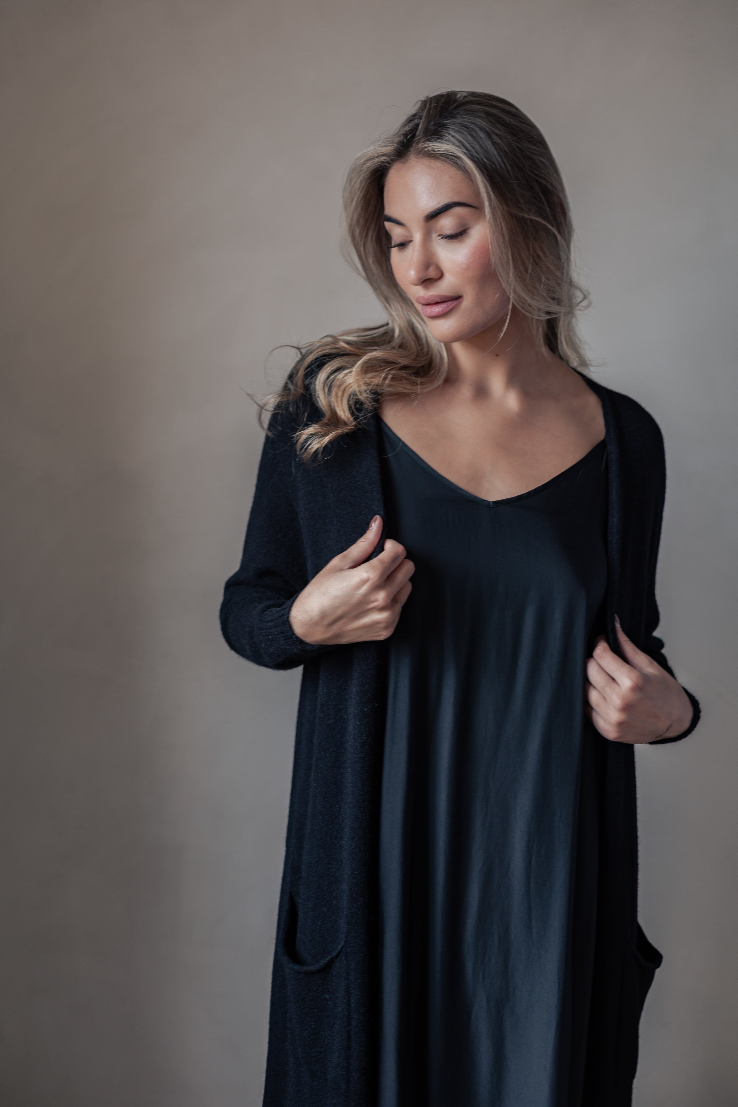 Ylellisen pehmeä ja ajattoman tyylikäs pitkä neuletakki, joka sopii täydellisesti niin arkeen kuin kerrospukeutumiseen. Edessä on kätevät  taskut ja helmassa sekä hihansuissa kevyet resorit. Koko hienouden kruunaa erityinen viskoosisekoite-neuloksen materiaali.