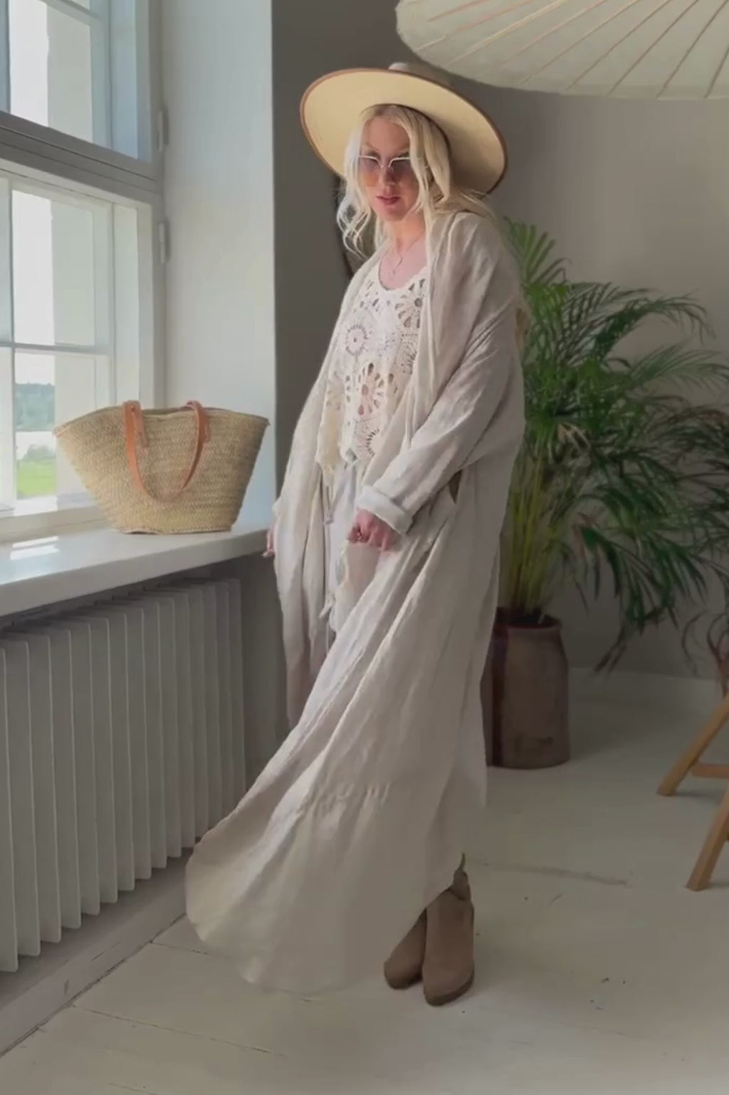 Kevyen hulmuava, pellavainen kaftaani, jossa shaalikaulus, käännetyt, aavistuksen vajaamittaiset hihat ja edessä taskut. Sivuilta pidempi malli. Täydellinen kesäpäivään shortsien ja topin kanssa yhdistettäväksi! Kaftaanissa ei ole napitusta tai muuta suljentaa edessä.