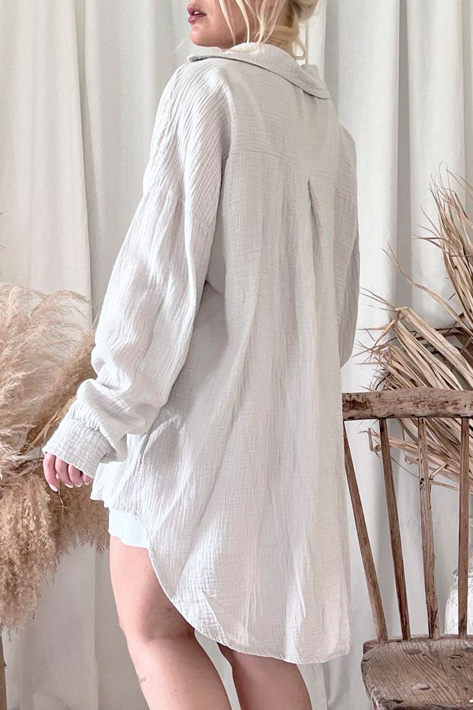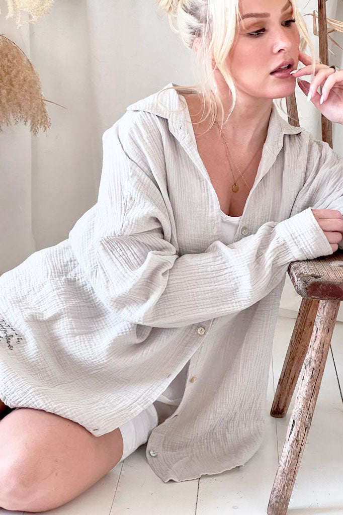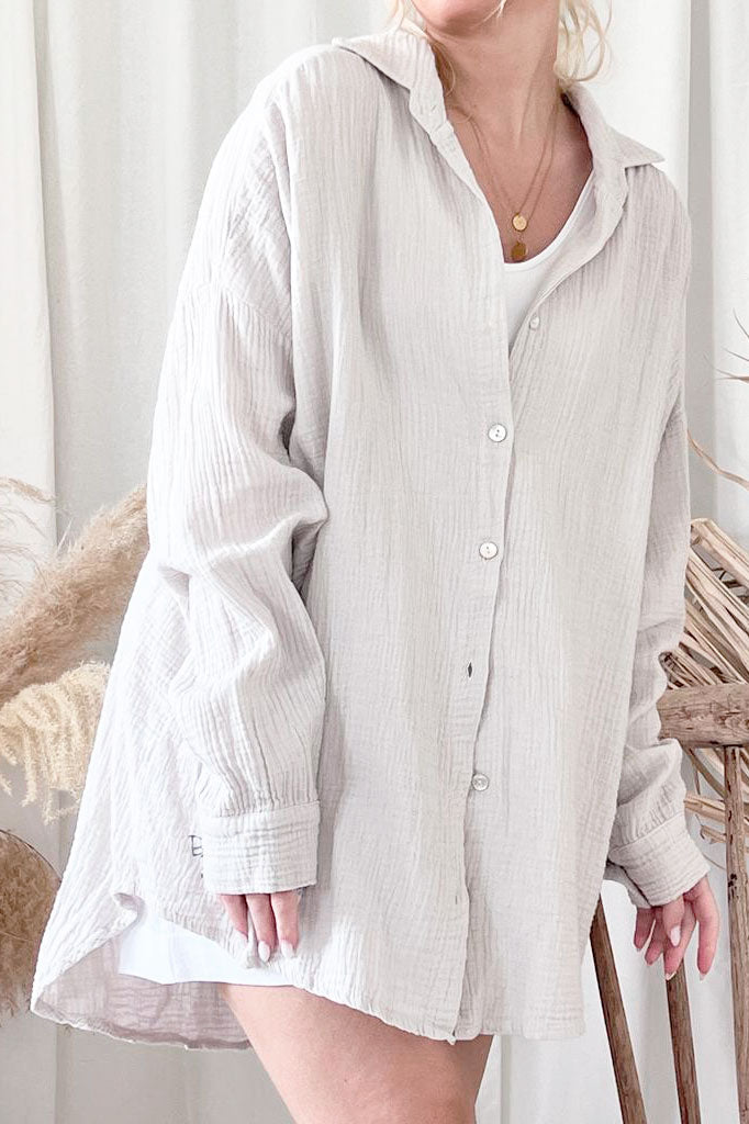 Rento, huolitellun tyylikäs v-aukkoinen paita napeilla. Paita on pehmeää ja ilmavaa puuvillaa, joka tuntuu kevyeltä ja pehmeältä iholla. Lyhyempi edestä ja takaa pidempi, jossa on pyöristetty helma. Madalletut olkapäät ja hihansuissa kauniit helmiäiset napit.
