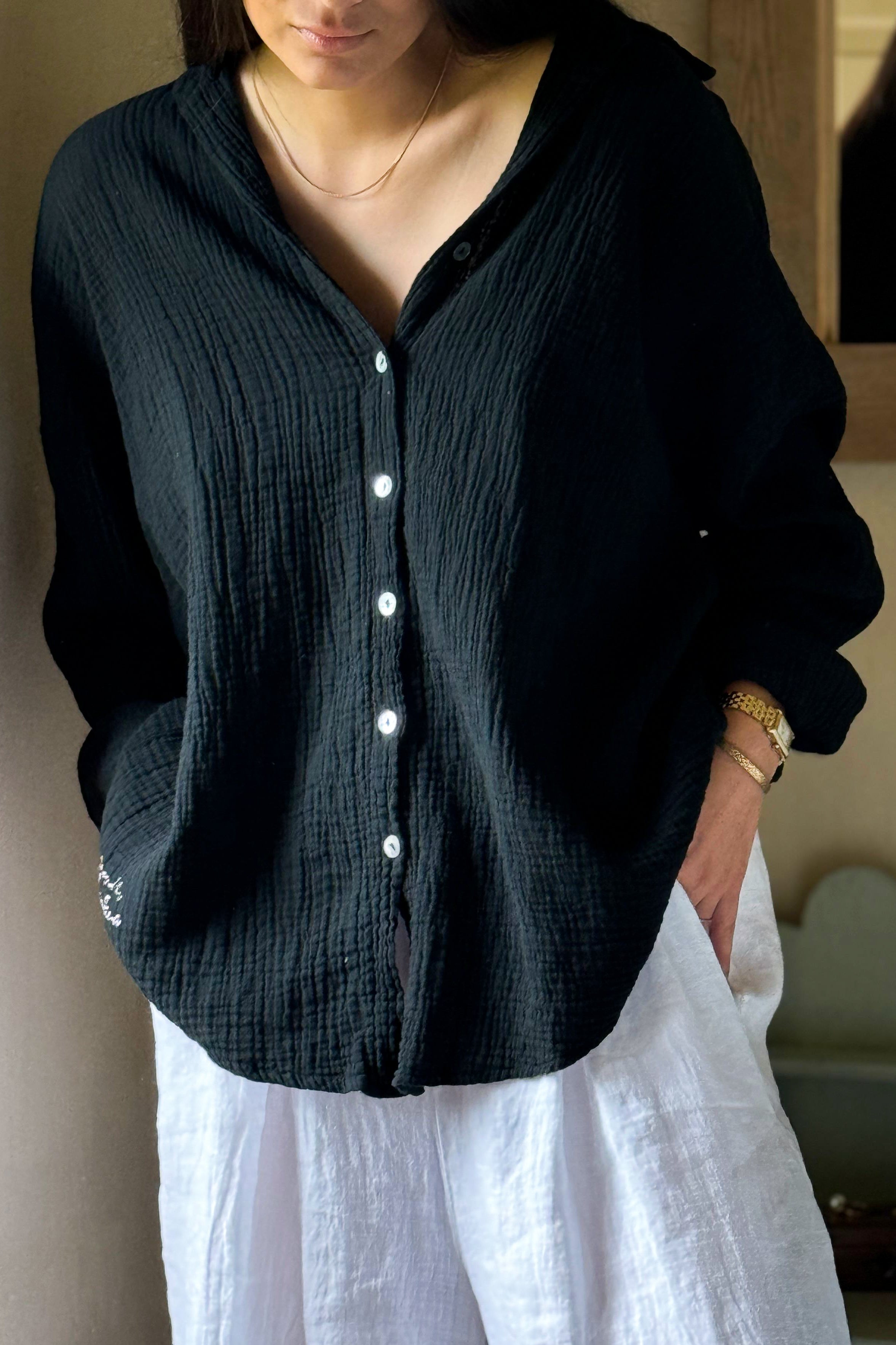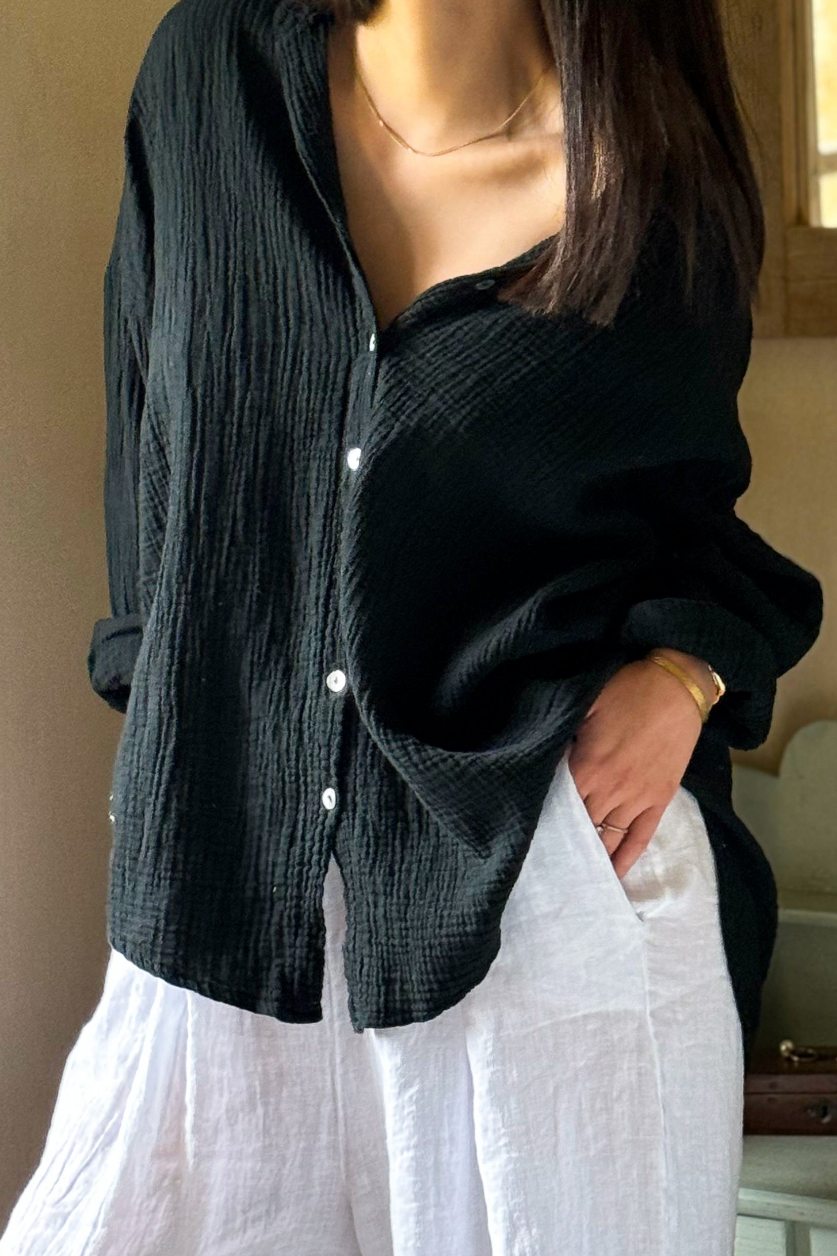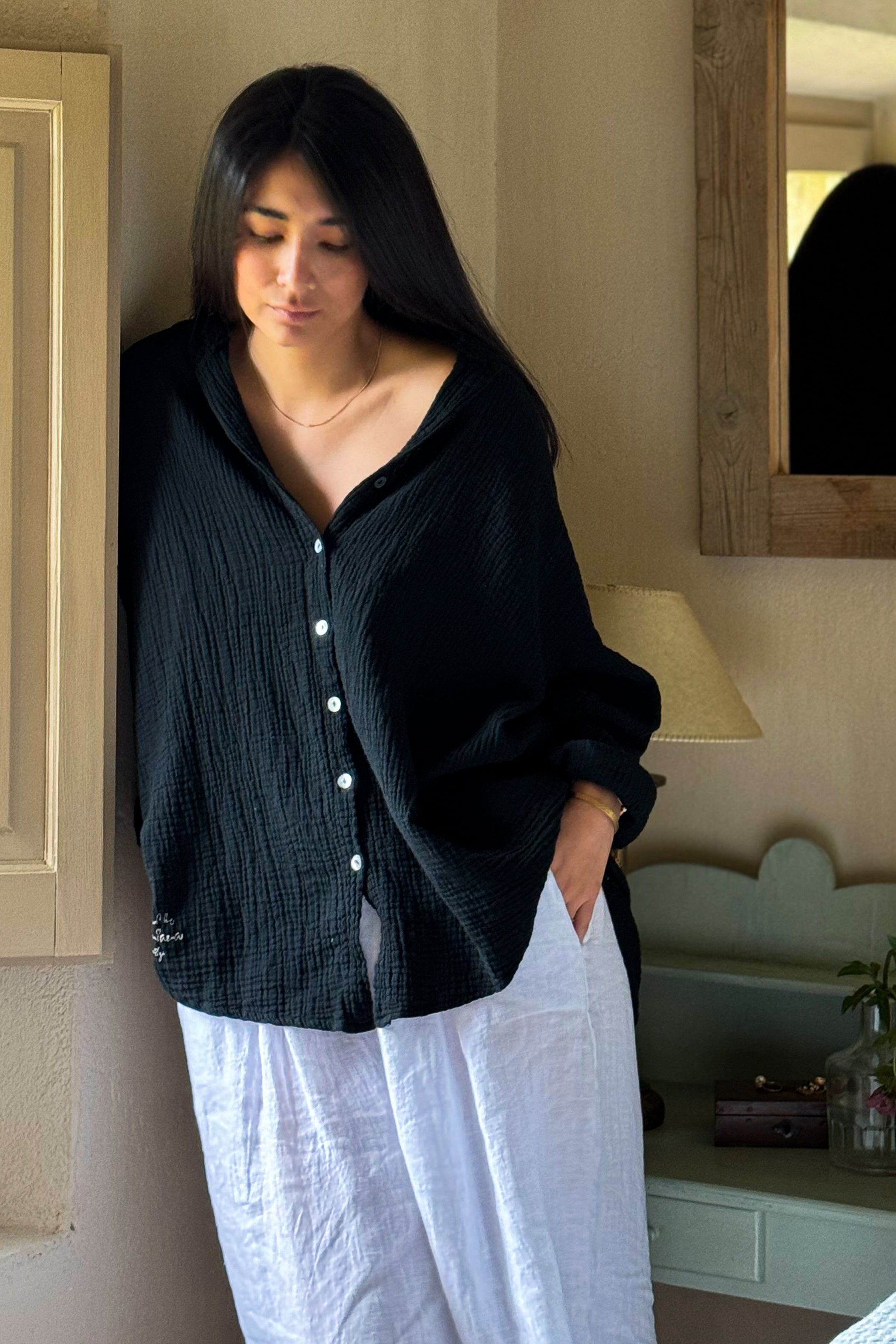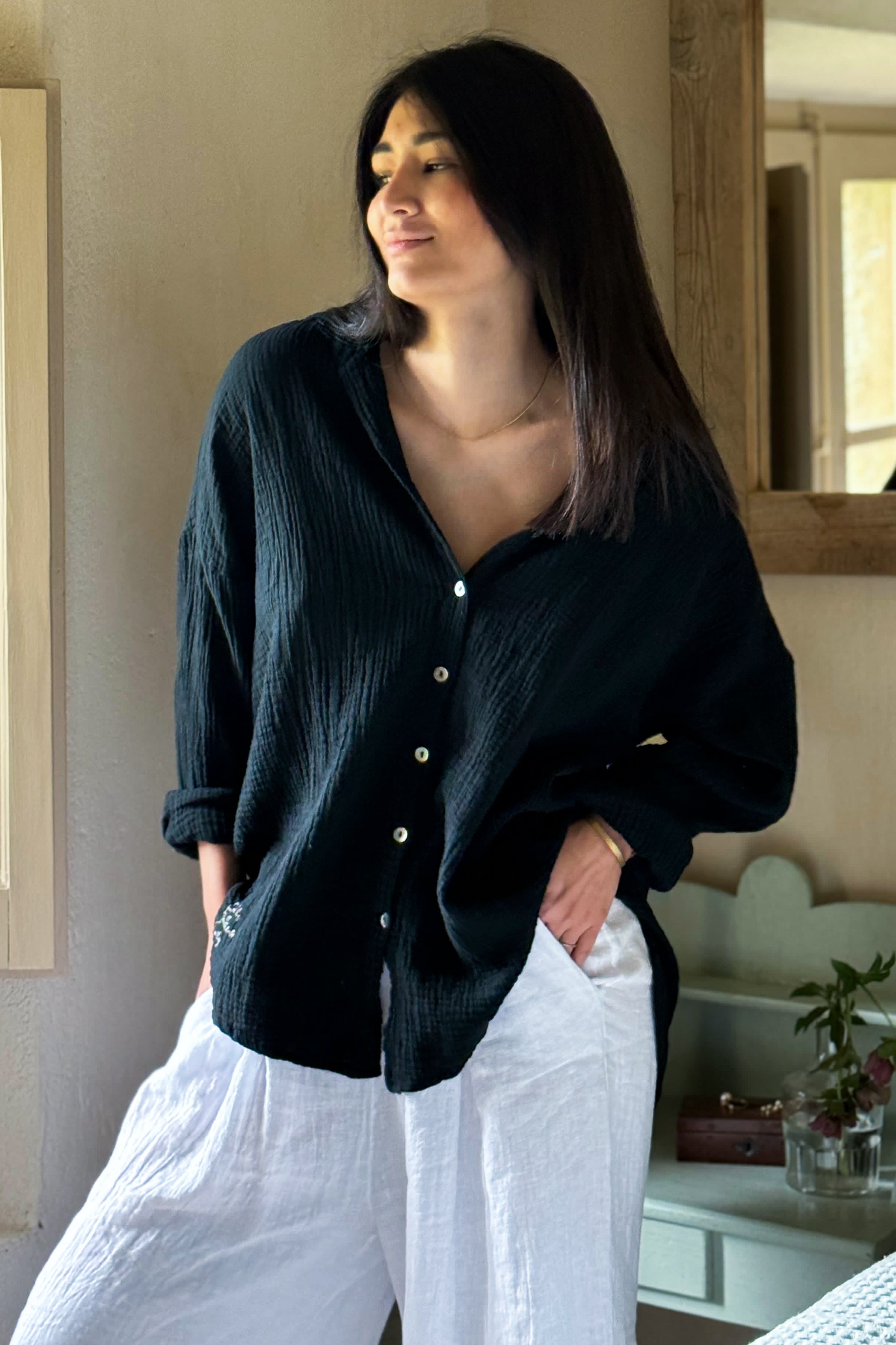 Rento, huolitellun tyylikäs v-aukkoinen paita napeilla. Paita on pehmeää ja ilmavaa puuvillaa, joka tuntuu kevyeltä ja pehmeältä iholla. Lyhyempi edestä ja takaa pidempi, jossa on pyöristetty helma. Madalletut olkapäät ja hihansuissa kauniit helmiäiset napit.