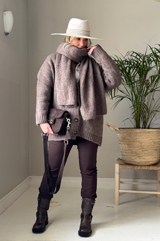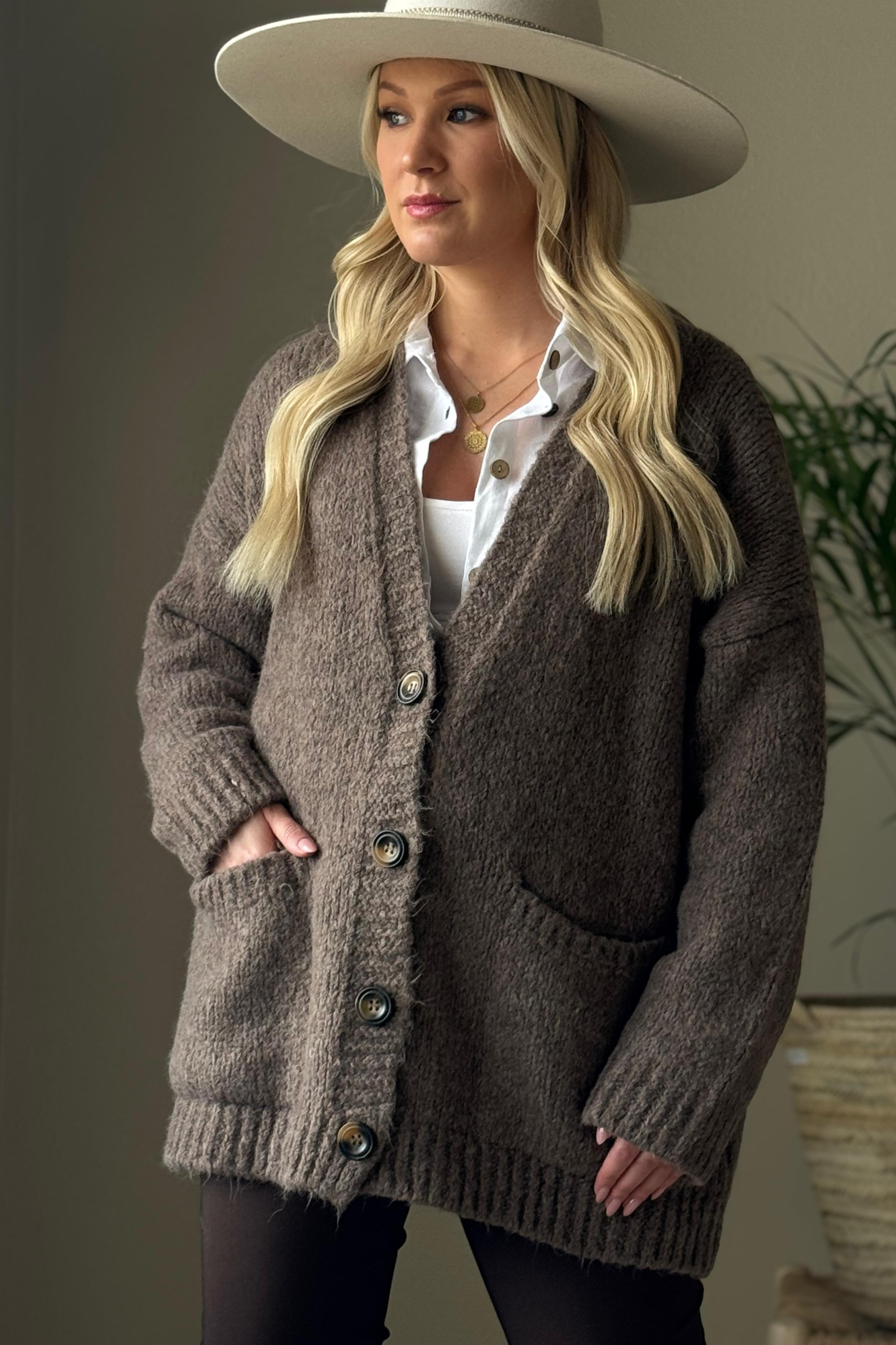 Pehmeä ja ihanan muhkea neuletakki jokapäiväiseen käyttöön. Edessä on kauniit suuret napit ja kätevät taskut. Hihoissa ja helmassa kevyt resori.