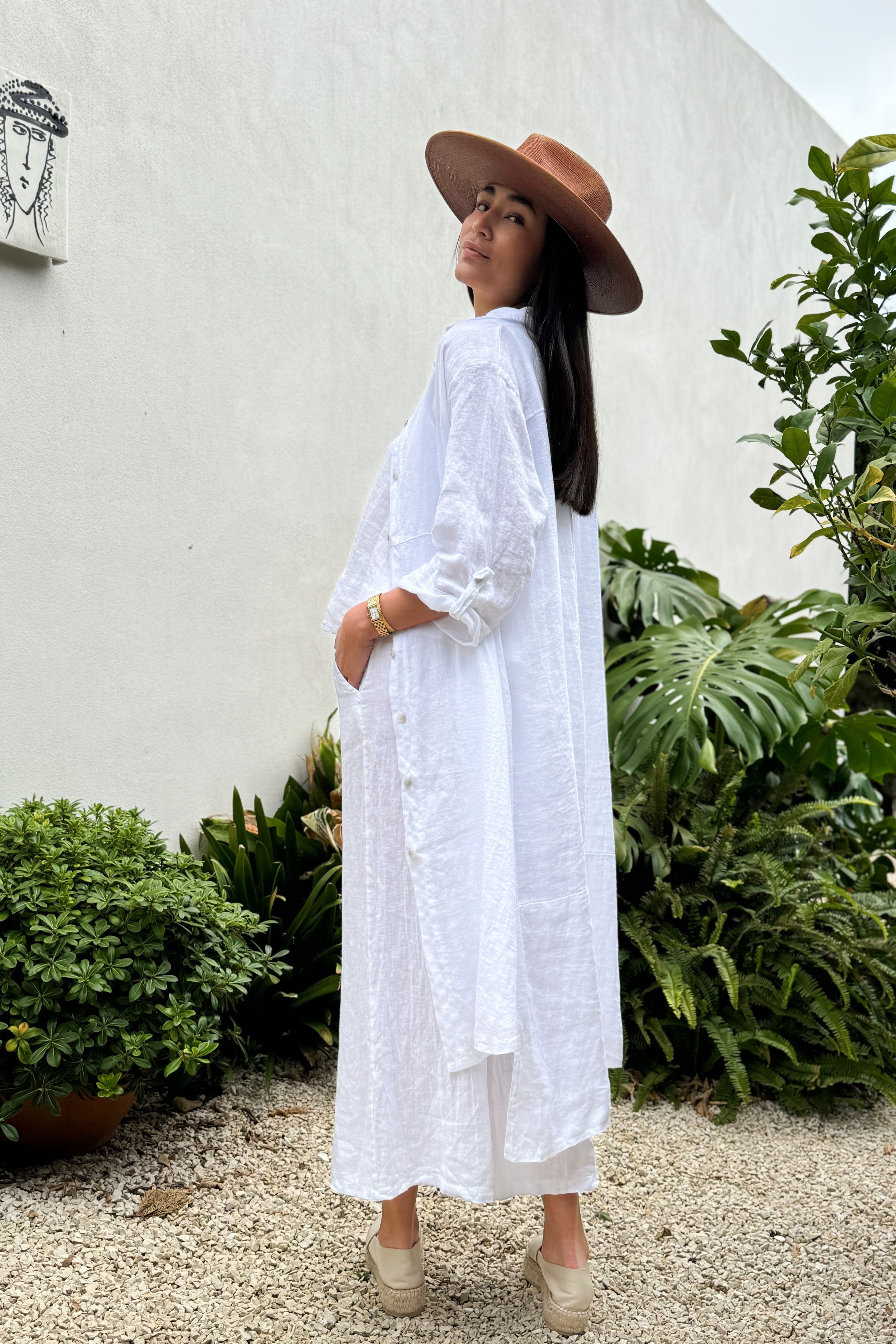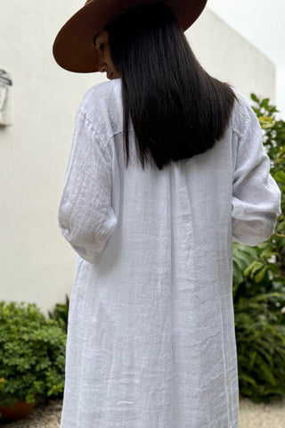 Mukava ja rento pellavapaitamekko. Helmiäisnapit, halkiot helmassa ja käännetyt 3/4 hihat.